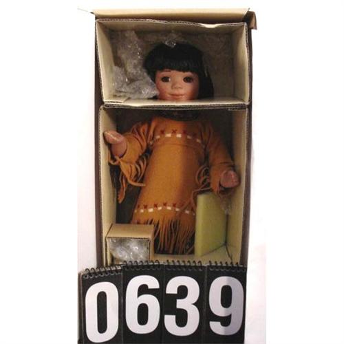 From the Danbury Mint and Artaffects by Perillo is "Bird Song" porcelain doll. In mint condition. Doll is about 14 inches tall and box measures 16" x 7" x 5.5" and weighs 2 lbs 8 oz. [81]
