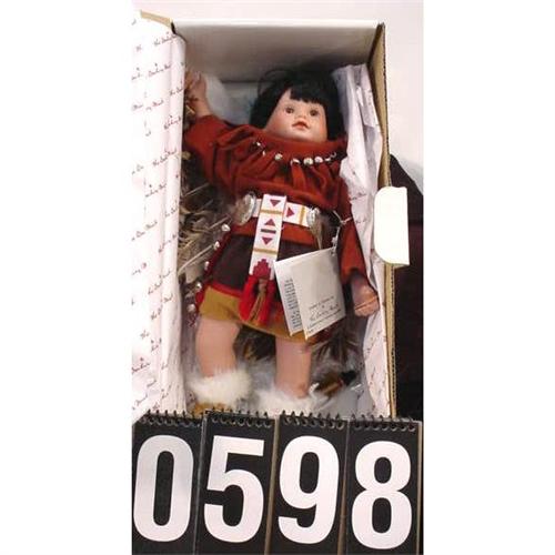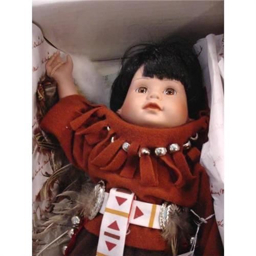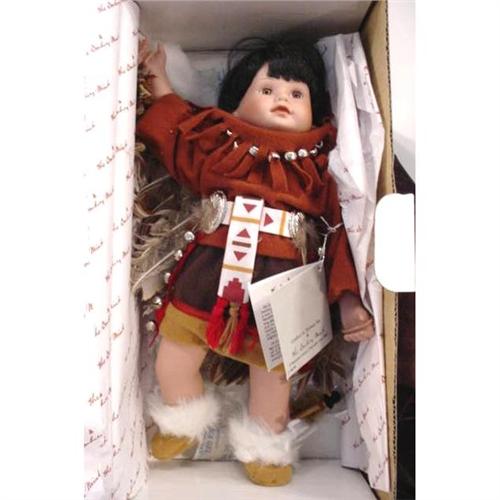 From the Danbury Mint, porcelain doll "Little Eagle Dancer" by Elke Hutchens made 1992. In wonderful mint condition, ensemble has real ringing bells on it. Doll measures 12 inches tall and box itself measures 14" x 7" x 5" and weighs 1 lb 11 ounces. [81]