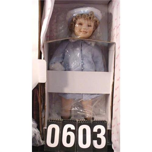 From Danbury Mint, Shirley Temple "Sunday Best" from the series entitled "The Shirley Temple Toddler Doll Collection." Doll is in excellent condition and made in 1996. Doll measures 18 inches tall and box measures 20" x 10" x 5" and weighs 4 lbs. [81]