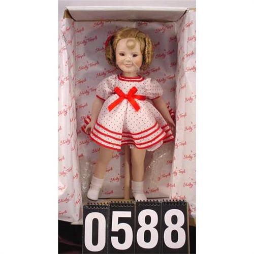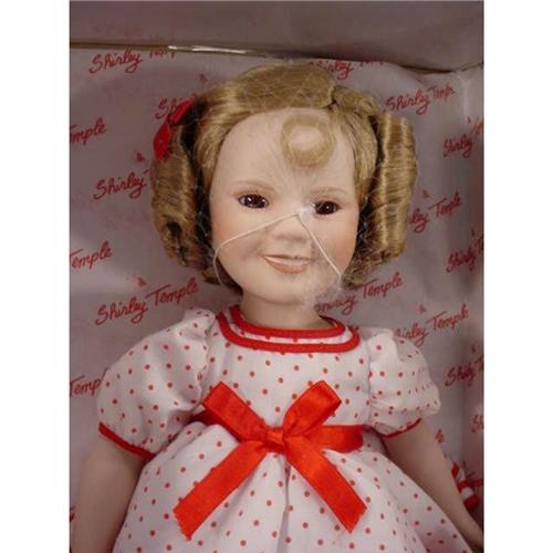 Danbury Mint Porcelain Doll. "Shirley Temple: Dolls of the Silver Screen." Shirley in Polka Dot dress with porcelain head, arms, and legs. In beautiful condition, made in late 80's, early 90's. Doll measures 14 inches tall. Box measures 16" x 8.5" x 5" and weighs 2 lbs 13 oz. [81]