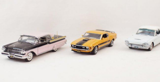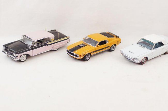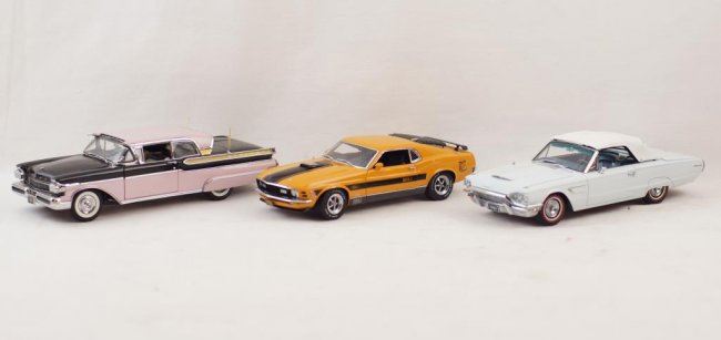 1965 Ford T-bird conv., 57 Mercury "Turnpike Cruiser" 50th Anniversary Edition with box, 70 Ford Mustang Mach 1 Twister Special