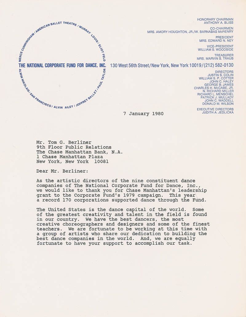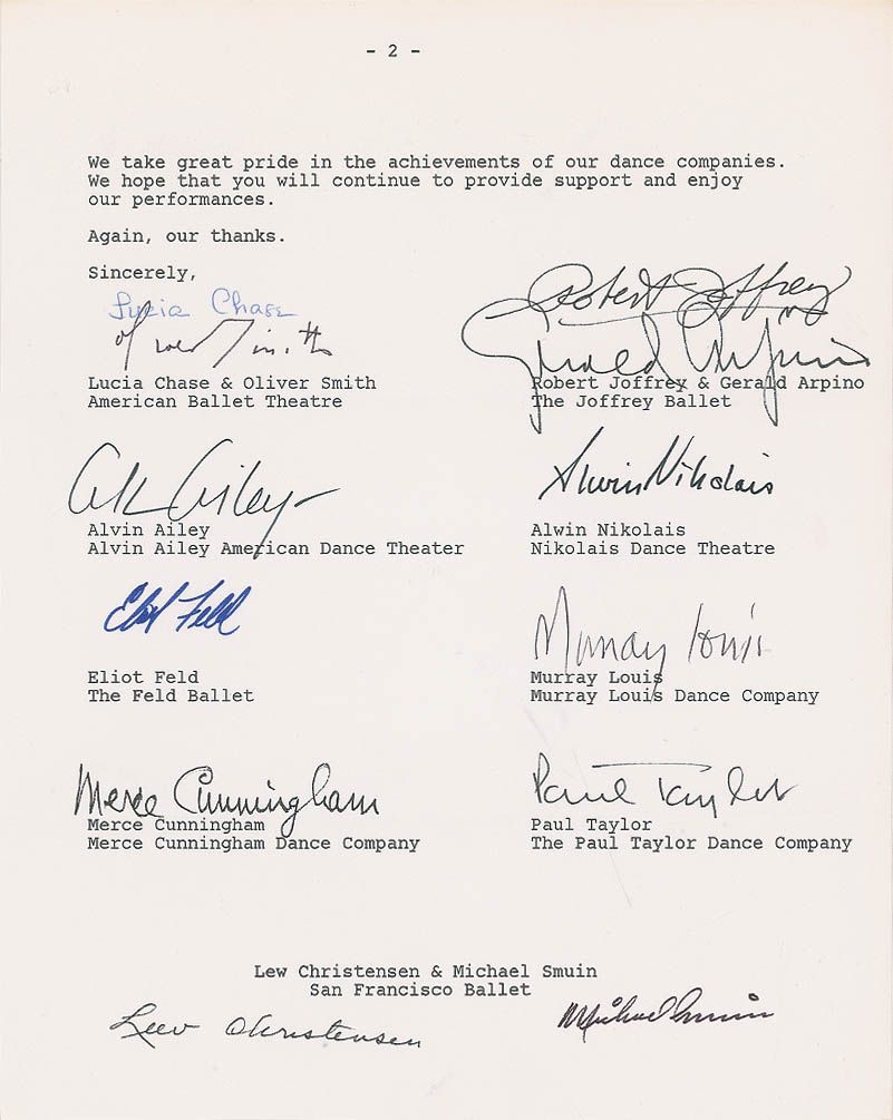 TLS, two pages, 8.5 x 11 and 8 x 10 respectively, National Corporate Fund for Dance letterhead, January 7, 1980. Letter of thanks to a contributor. In part: “As the artistic directors of the nine constituent dance companies of The National Corporate Fund for Dance, Inc. we would like to thank you for Chase Manhattan’s leadership grant to the Corporate Fund’s 1979 campaign. This year a record 170 corporations supported dance through the Fund. The United States is the dance capital of the world. Some of the greatest creativity and talent in the field is found in our country. We have the best dancers, the most creative choreographers and designers and some of the finest teachers.” Signed on the second page in ink and felt tip by Alvin Ailey, Robert Joffrey, Lucia Chase, and Oliver Smith of the American Ballet Theatre; Gerald Arpino [co-founder of the Joffrey Ballet]; Alwin Nikolais, Eliot Feld, Murray Louis, Merce Cunningham, Lew Christensen, and Michael Smuin of the San Francisco Ballet; and Paul Taylor. In fine condition, with horizontal mailing folds.