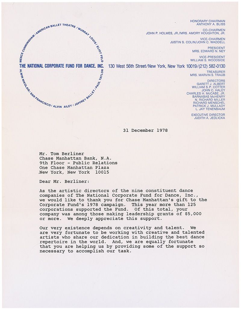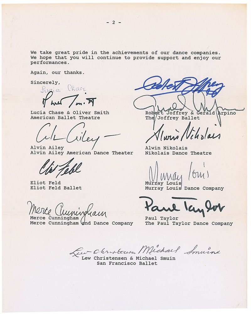TLS, two pages, 8.5 x 11 and 8 x 10 respectively, National Corporate Fund for Dance letterhead, December 31, 1978. Letter of thanks to a contributor. In part: “As the artistic directors of the nine constituent dance companies of The National Corporate Fund for Dance, Inc., we would like to thank you for Chase Manhattan’s gift to the Corporate Fund’s 1978 campaign. This year more than 125 corporations supported the Fund. Of this total, your company was among those making leadership grants of $5,000 or more. We deeply appreciate this support. Our very existence depends on creativity and talent. We are very fortunate to be working with creative and talented artists who share our dedication in building the best dance repertoire in the world. And, we are equally fortunate that you are helping us by providing some of the support so necessary to accomplish our task.” Signed on the second page in ink and felt tip by Alvin Ailey, Robert Joffrey, Lucia Chase, and Oliver Smith of the American Ballet Theatre; Gerald Arpino [co-founder of the Joffrey Ballet]; Alwin Nikolais, Eliot Feld, Murray Louis, Merce Cunningham, Lew Christensen, and Michael Smuin of the San Francisco Ballet, and Paul Taylor. In fine condition, with a few light creases to first page and light edge toning to second page.