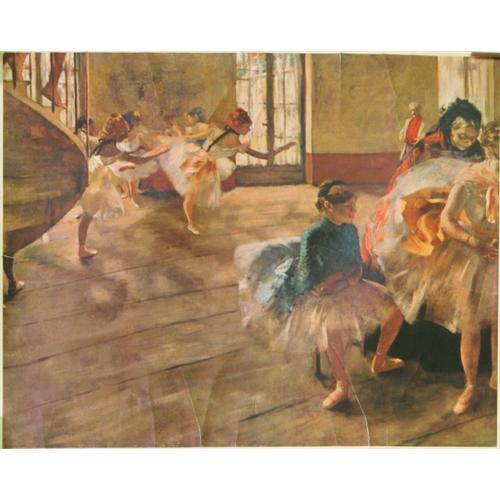 This print is a reproduction of Degas? famous ?Dance Exercise? painting. It takes an intimate look at his favorite subject, ballet dancers, while they practice in the studio. Degas preferred to observe his dancers off the stage, where he found them less inhibited and poised. For example, the primary figure in this picture is sitting with her arms crossed, slightly slouched, while other girls practice in the background. A man, presumably the instructor, observes the girls from the upper right corner. This painting is classis Degas, from the subject matter down to the color and painting technique. The colors are warm and the painting applied in a sketchy manner. This is a beautiful picture printed on quality paper. There are a few tears around the edges, but a good frame would hide them.