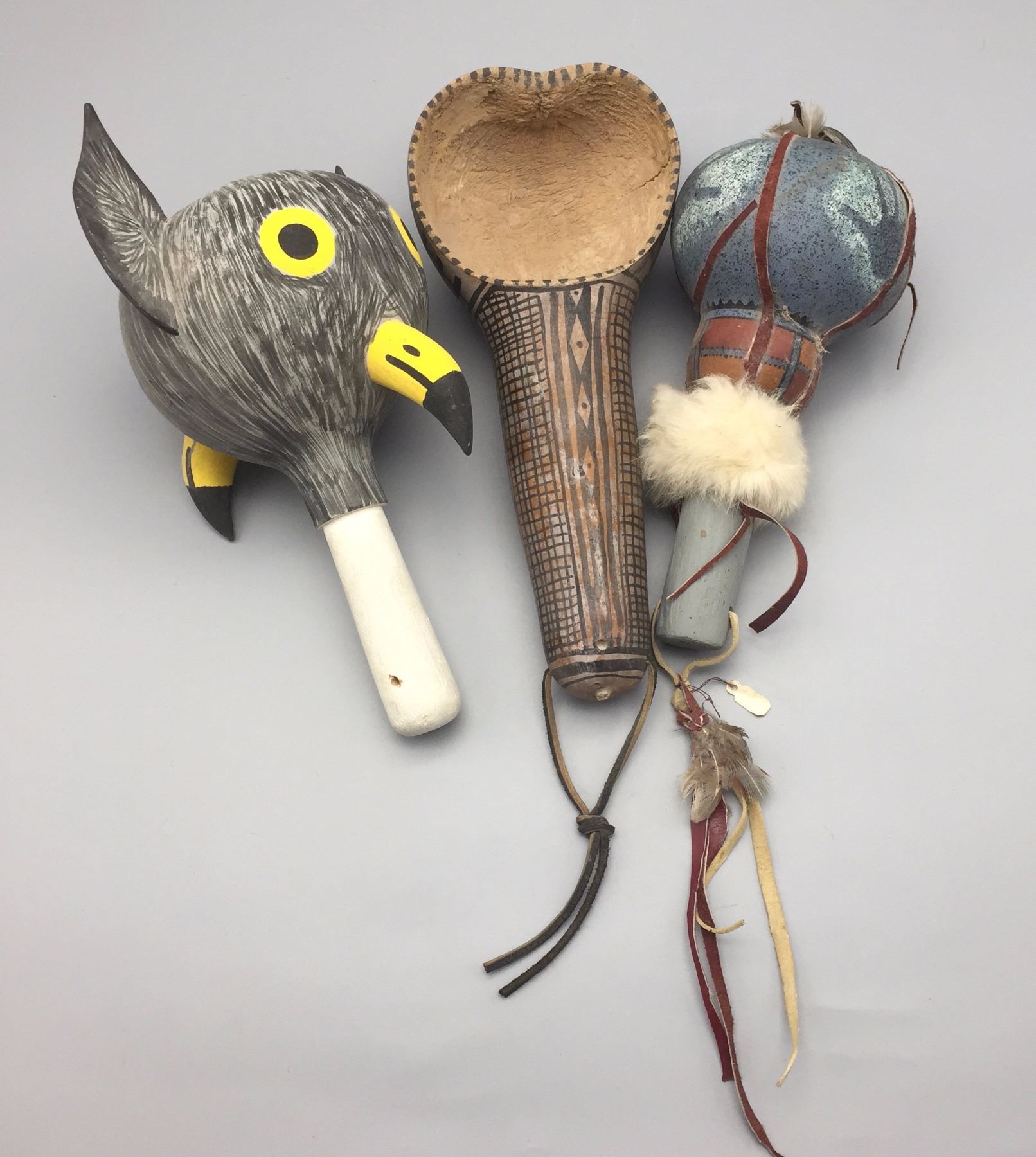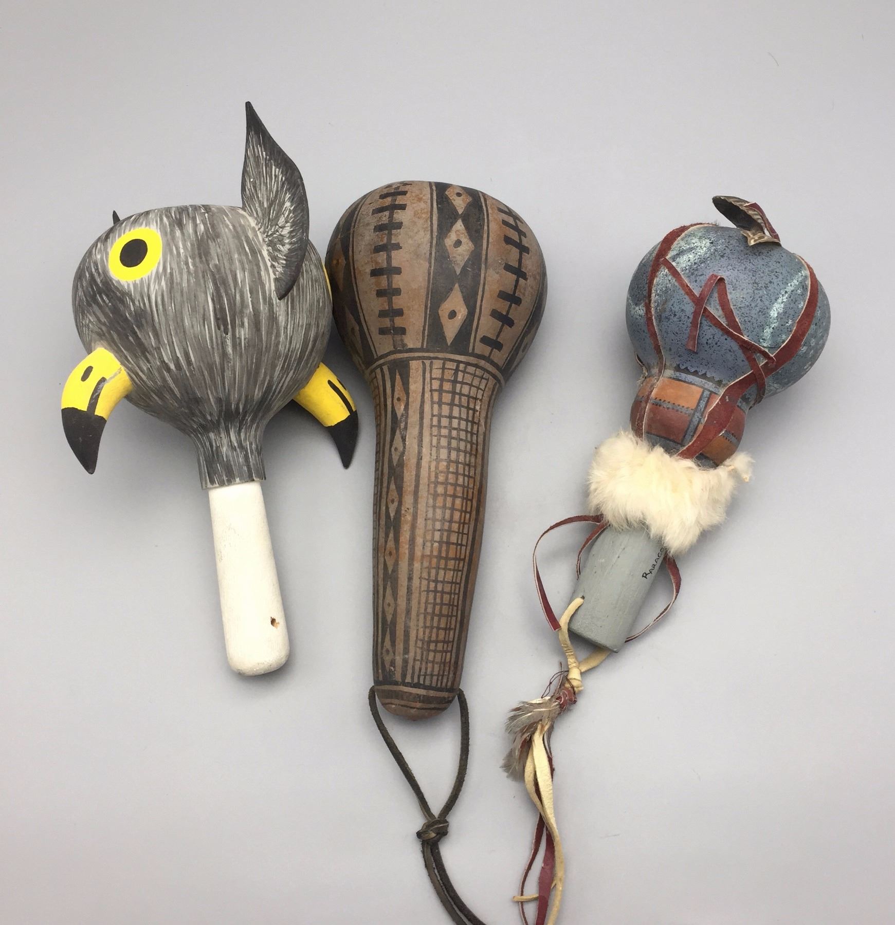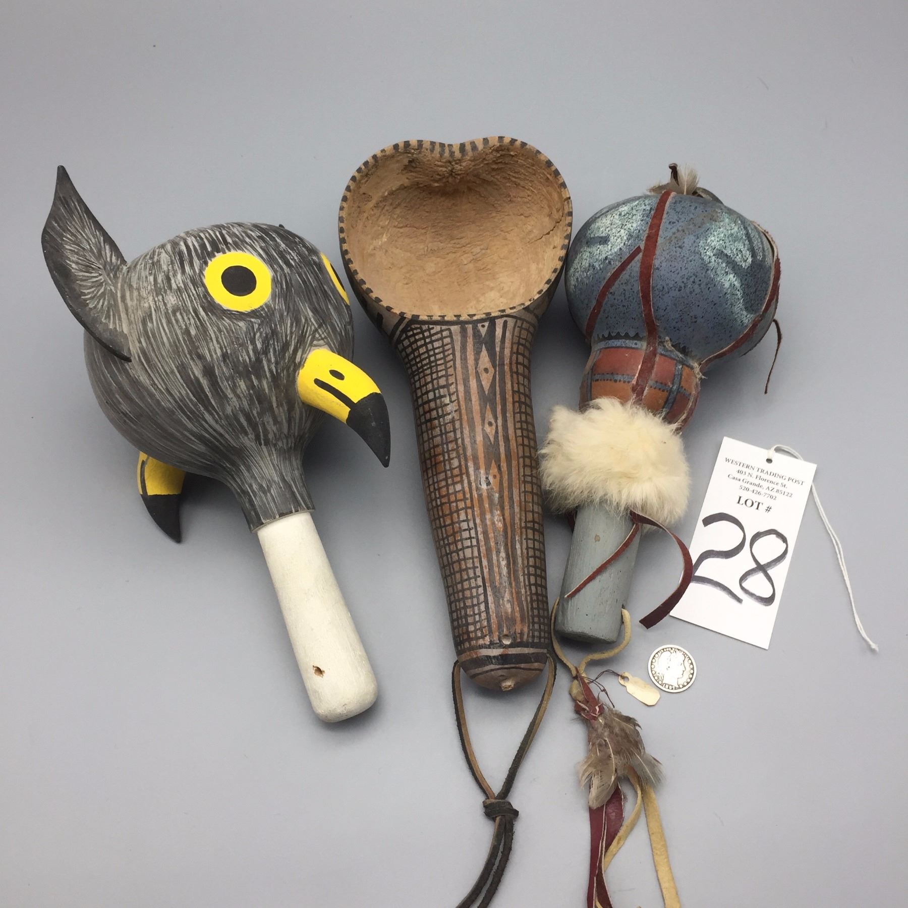 Maker: Various. Approx. Age: Fairly modern. Size: Items range from 4 1/2” to 8” at their widest and 9” to 11 3/4” h. Additional Info: 2 dance rattles and a painted gourd. Condition: Good for their age (please note gourd has a crack in it), NOS from a dealer who is retiring. Please look closely at the pictures - they are an important part of our description. Shipping: There will be a $8 handling / packaging fee for shipping this lot. The actual cost of postage will be added on top of that.