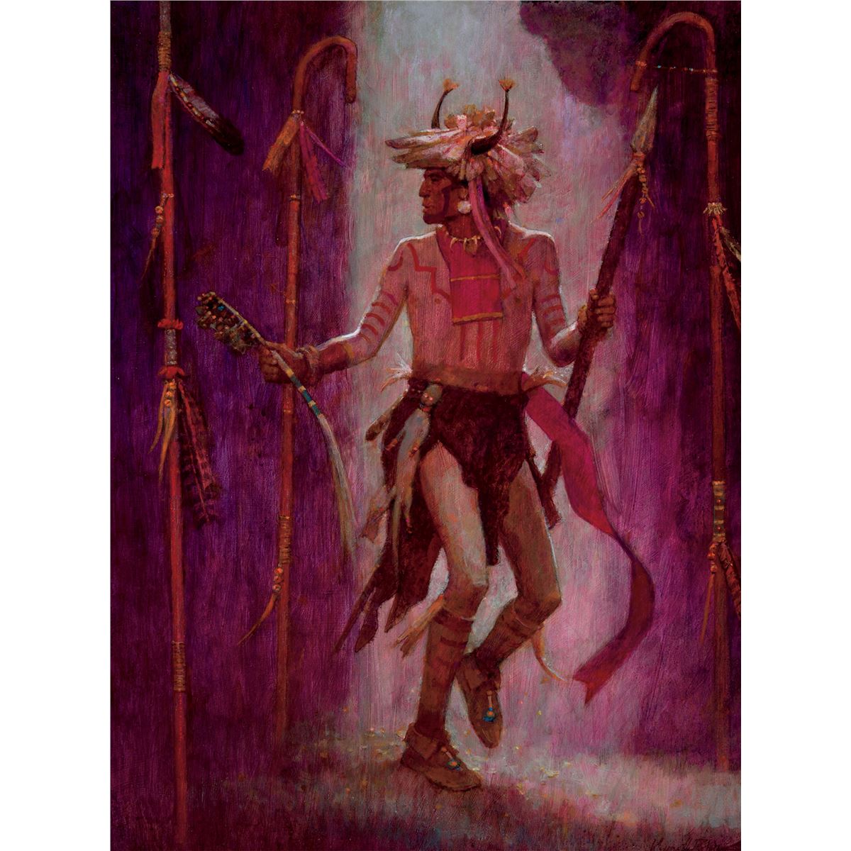 Ken Riley was born in Missouri in 1919. He loved both music and art, played the drums and painted. But art sunk its hooks deep, and he soon found himself studying, first in Kansas City with Thomas Hart Benton, then in New York with George Bridgman and Harvey Dunn. When the Second World War broke out, Riley put his talents to work as a combat artist stationed on the U.S.S. Middleton, a converted commercial liner that saw a great deal of action in the Pacific Theater as an attack transport. After the war, Riley made a name for himself in illustration, spending the next quarter of a century producing work for The Saturday Evening Post, National Geographic, Life, and a host of other periodicals. In 1960, on assignment for The Society of Illustrators, Riley visited Yellowstone and the Grand Tetons and the germ of a career move began to sprout. Eventually, he moved to Tucson and set his sights on becoming an easel painter. His subject? The landscape and history of the American West. IllustrationÕs loss was Western ArtÕs gain. Riley never looked back, and we have never looked away. As for accolades, he was a founding member of the National Academy of Western Art in 1973 and has been a member of the Cowboy Artists of America since 1982, He has won every important award in the field, including Best of Show in the Cowboy Artists of America exhibition and the Prix de West. His paintings can be found in important public and private collections across the nation and around the world, including the White House, the Smithsonian Institution, the Booth Western Art Museum, and the Phoenix Art Museum. When he made the moved from illustration, Riley adapted his skills, developing a signature style in Western Art that owes something to classical bas-relief sculpture, Renaissance fresco, and the mural tradition, as evidenced in the Preface to the book, West of Camelot: The Historical Paintings of Kenneth Riley, by art historian Susan Hallsten McGary: ÒRiley uses the past as inspiration and then passes through it to personal revelation about the harmony and perfection to be found in the human condition. On the pediments of the Parthenon and on the ceilings and walls of Renaissance churches we find the classical ideal Kenneth Riley portrays in the guise of a legendary Indian shaman named Manabozho.Ó Even in smaller works and in the small studies he paints that inspire him to build major paintings, RileyÕs unerring sense of design creates a stillness, an air of myth and legend. With a few changes, Study for Dog Dancers and Dance of Four Lances might be found carved in stone on the side of a Mayan or Hindu temple or on the walls of a tomb in Egypt or Mycenae. In Study for Dog Dancers Riley limits his palette and fills the frame with overlapping figures in shallow relief. In Dance of Four Lances, the lances themselves circle the dancer, becoming animated partners in spirit. RileyÕs approach focuses our eyes and accentuates the drama of the religious pageants. This kind of attention to craft, demonstrating the breadth of his artistic and historical education is what makes Ken Riley the through line between the early masters of the West, the Golden Age of American Illustration and the contemporary Western Art scene. He is inimitable and indispensable.