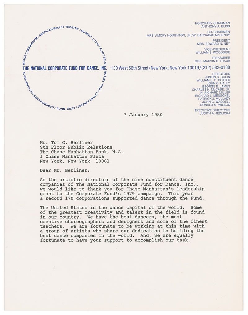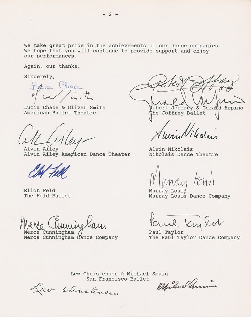 TLS, two pages, 8.5 x 11 and 8 x 10 respectively, National Corporate Fund for Dance letterhead, January 7, 1980. Letter of thanks to a contributor. In part: “As the artistic directors of the nine constituent dance companies of The National Corporate Fund for Dance, Inc. we would like to thank you for Chase Manhattan’s leadership grant to the Corporate Fund’s 1979 campaign. This year a record 170 corporations supported dance through the Fund. The United States is the dance capital of the world. Some of the greatest creativity and talent in the field is found in our country. We have the best dancers, the most creative choreographers and designers and some of the finest teachers.” Signed on the second page in ink and felt tip by Alvin Ailey, Robert Joffrey, Lucia Chase, and Oliver Smith of the American Ballet Theatre; Gerald Arpino [co-founder of the Joffrey Ballet]; Alwin Nikolais, Eliot Feld, Murray Louis, Merce Cunningham, Lew Christensen, and Michael Smuin of the San Francisco Ballet, and Paul Taylor. In fine condition.