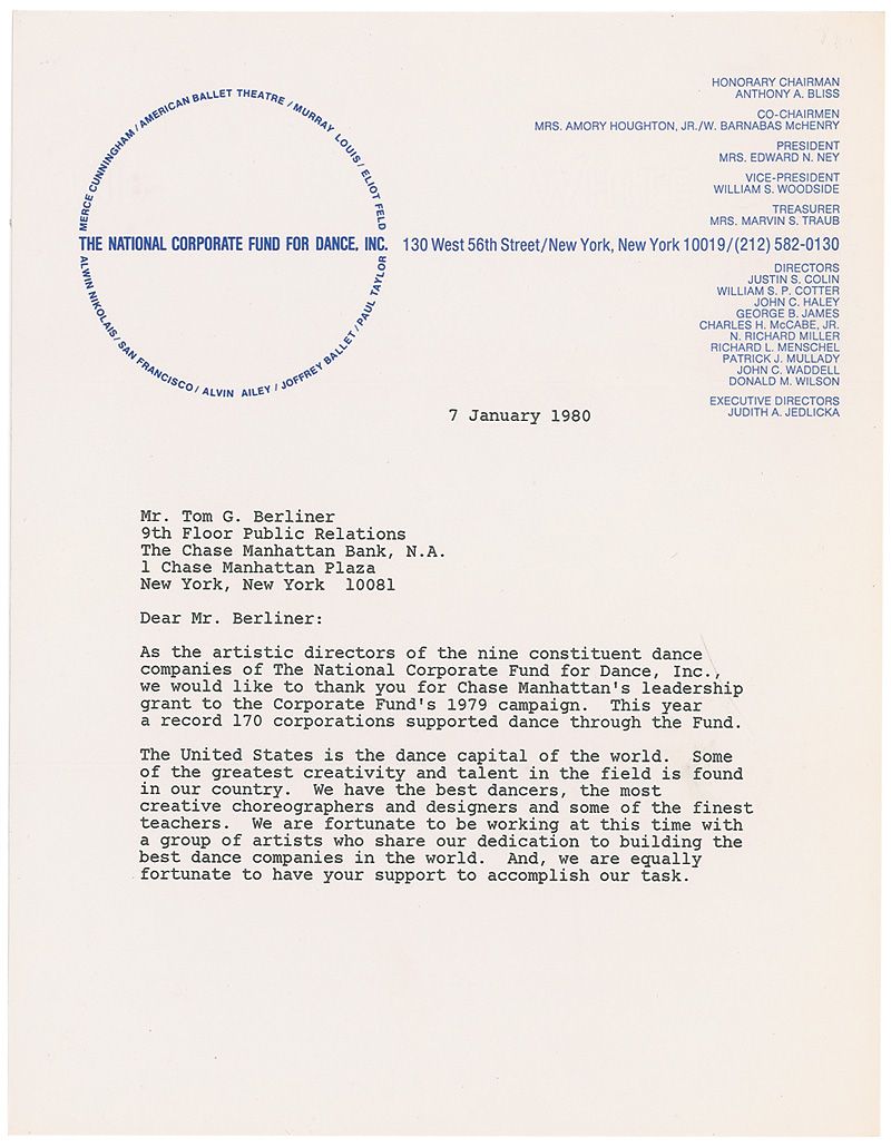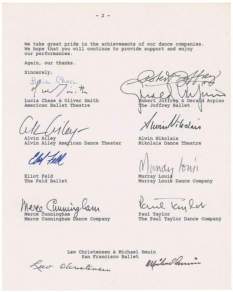 TLS, two pages, 8.5 x 11 and 8 x 10 respectively, National Corporate Fund for Dance letterhead, January 7, 1980. Letter of thanks to a contributor. In part: “As the artistic directors of the nine constituent dance companies of The National Corporate Fund for Dance, Inc. we would like to thank you for Chase Manhattan’s leadership grant to the Corporate Fund’s 1979 campaign. This year a record 170 corporations supported dance through the Fund. The United States is the dance capital of the world. Some of the greatest creativity and talent in the field is found in our country. We have the best dancers, the most creative choreographers and designers and some of the finest teachers.” Signed on the second page in ink and felt tip by Alvin Ailey, Robert Joffrey, Lucia Chase, and Oliver Smith of the American Ballet Theatre; Gerald Arpino [co-founder of the Joffrey Ballet]; Alwin Nikolais, Eliot Feld, Murray Louis, Merce Cunningham, Lew Christensen, and Michael Smuin of the San Francisco Ballet; and Paul Taylor. In fine condition.