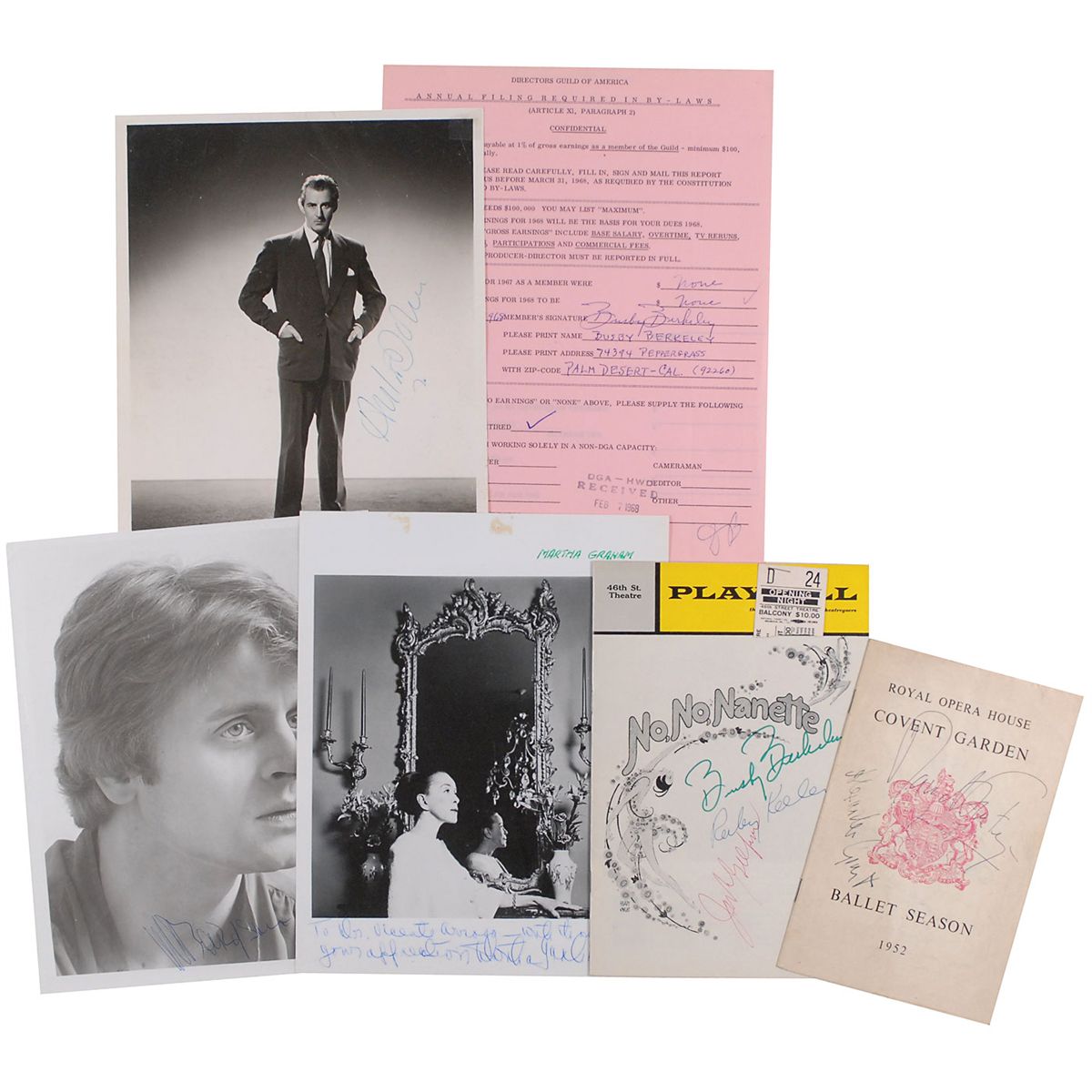 Six items: Director’s Guild of America document, one page, February 5, 1968, signed in blue ballpoint by Busby Berkeley; Royal Opera House program for the 1952 ballet season, signed on the front cover in fountain pen by Margot Fonteyn and Alexander Grant; playbill for No, No, Nanette, signed on the front cover in ink by Busby Berkeley, Ruby Keeler, and Jack Gilford; glossy 8 x 10 photo of Martha Graham, signed and inscribed in blue ballpoint; glossy 8 x 10 photo of Mikhail Baryshnikov, signed in blue ballpoint; and a glossy 8 x 10 photo of Anton Dolin, signed in blue ballpoint. In overall very good to fine condition, with heavy overall creases to the Dolin photo.