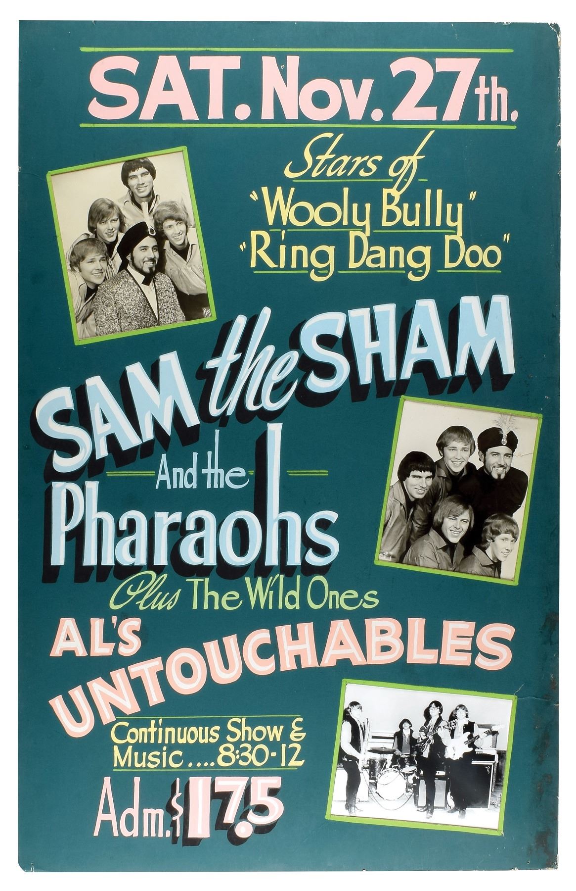One-of-a-kind hand-painted 28 x 43 poster for Sam the Sham and the Pharaohs at Danceland in Cedar Rapids, Iowa, on November 27, 1965, listing their hits, 'Wooly Bully' and 'Ring Dang Doo,' and featuring inset glossy photographs of the group. It also names Al's Untouchables as performers, and features a photo of them as well. The bottom of the poster advertises the price of admission as $1.75. In fine condition, with some creasing to the edges and some staining to the lower right corner. Billed as 'Iowa's Smartest Ballroom,' Danceland opened its doors in Cedar Rapids in 1928; the dance hall was a hotspot for hitmakers throughout the decades until its closure in 1968.