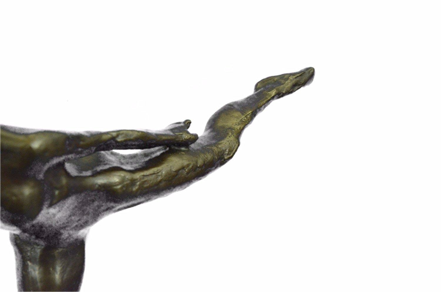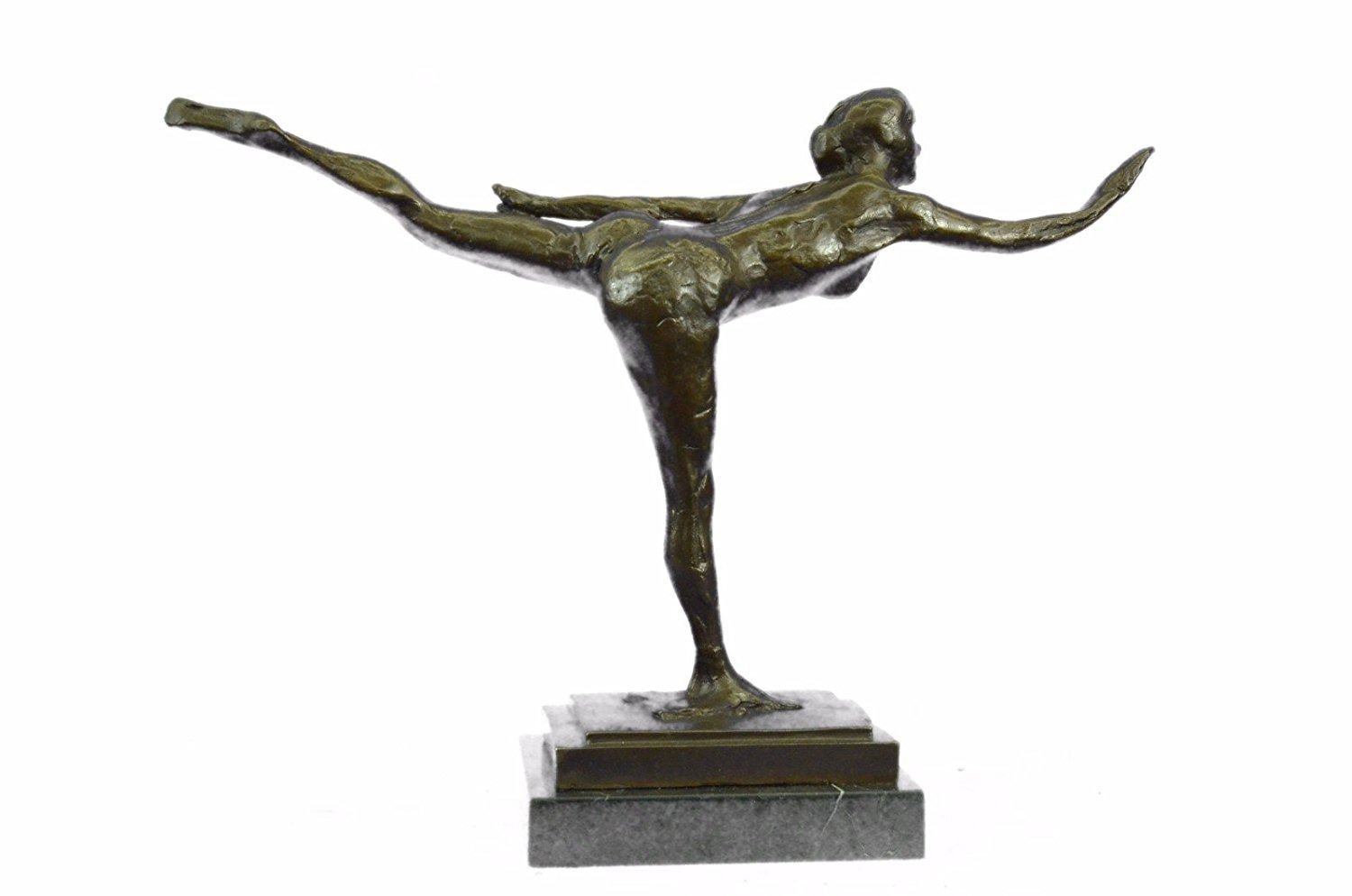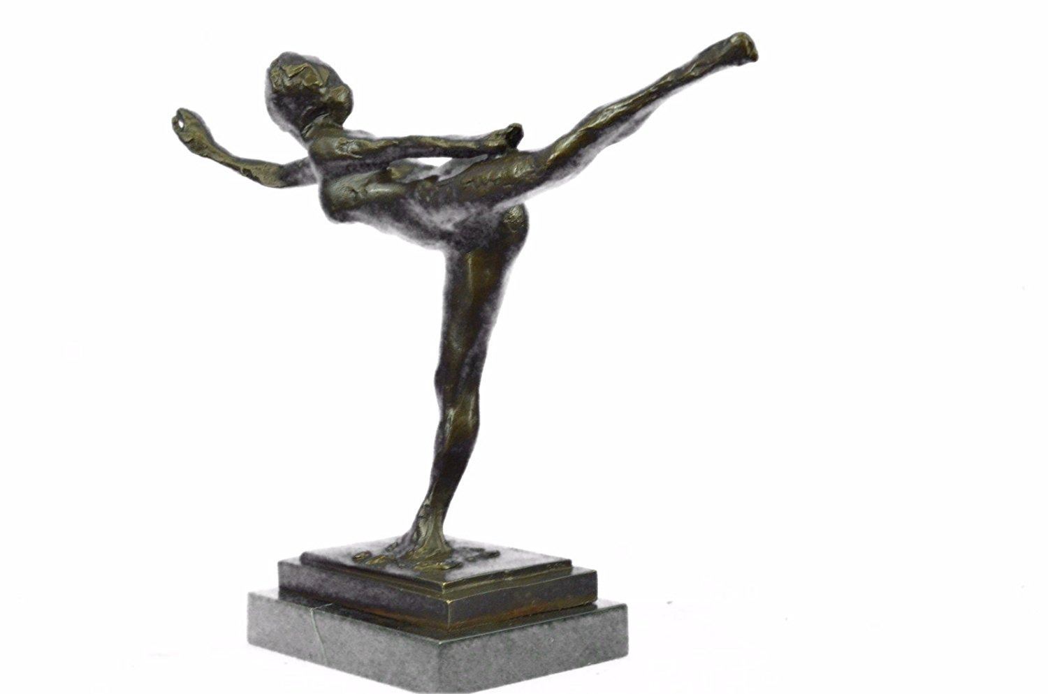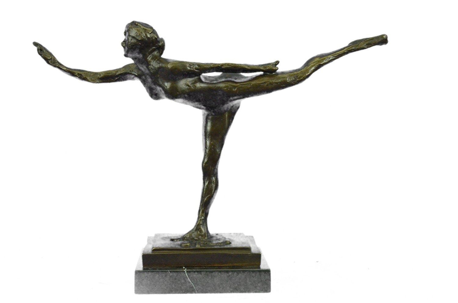 Ballerinas are known for their grace, athleticism, and beauty. Each bronze is handmade and hand finished with the highest quality craftsmanship designed to last a life time. This bronze will last forever outdoors. It is made to stand up to the elements and will look great wherever you place it with little or no maintenance. This is an excellent quality bronze masterpiece for impressive display in home, office, outdoors or as gifts. Our quality bronze sculpture can proudly be passed down from generation to generation. For over 40 years our bronzes are Foundry Direct which are handmade and cast in the traditional Lost Wax Casting Process like a 100 years ago. Bronze Dimensions with Marble Base: Height 12 X Width 17 inches. Weight: 10 LBS. Inventory: 18X16356581
