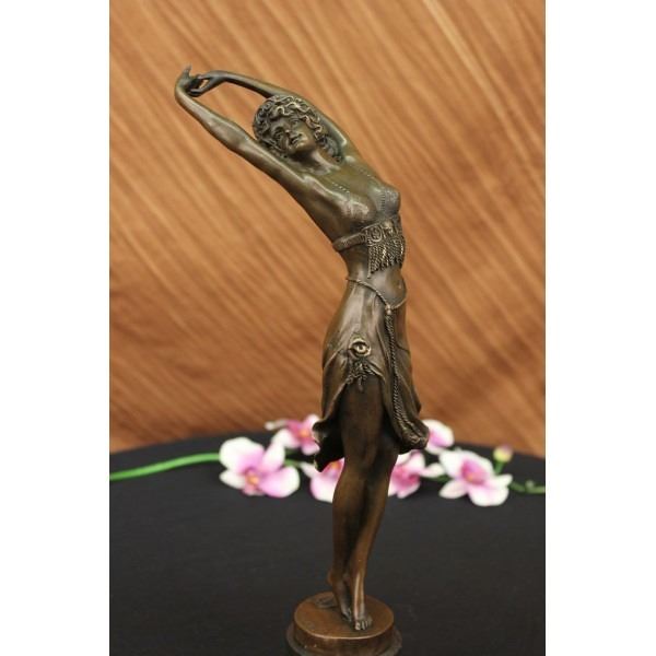 She holds her hand up ward with one hand behind her head she dances in the wind and gets taken to a whole new world. Her hair is long and curly and fly’s back from her face as she dances. Her dress is exquisite with detail and her skirt lifts up from the winds and flows between her legs. The bottom of the dress is ruffled giving her a cute feel. She wears a gorgeous necklace and arm bracelet. This sculpture was cast using the lost wax method and has a two tone brown patina and is mounted on a marble base. Bronze dimensions with marble base: Height 16 X Width 5 inches. Weight: 10 lbs. Please Note: This is a reproduction bronze sculpture from the original molded and signed. This featured bronze sculpture is a recast after the original, and has been done recently. This 100% bronze sculpture is an abstract piece certain to be a conversation piece.Please Note: This is a reproduction bronze sculpture from the original molded and signed. This featured bronze sculpture is a recast after the original, and has been done recently. This 100% bronze sculpture is an abstract piece certain to be a conversation piece.