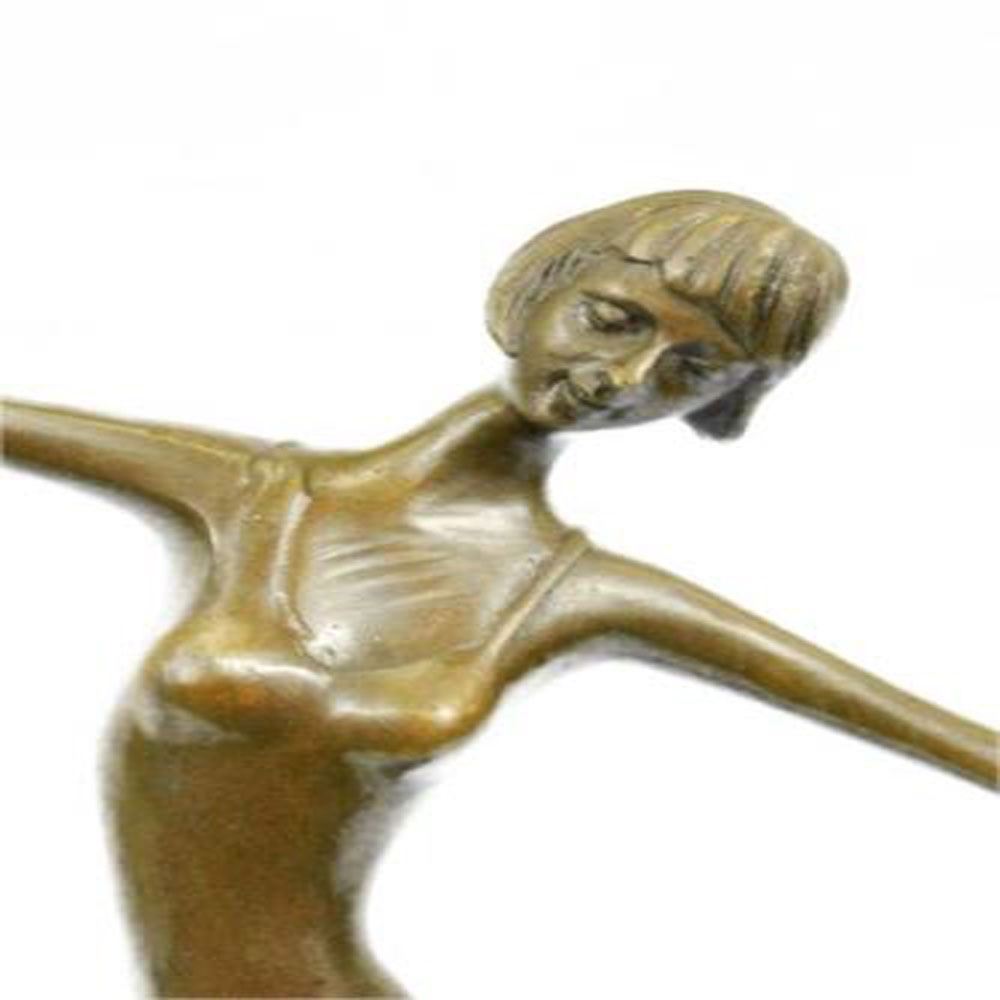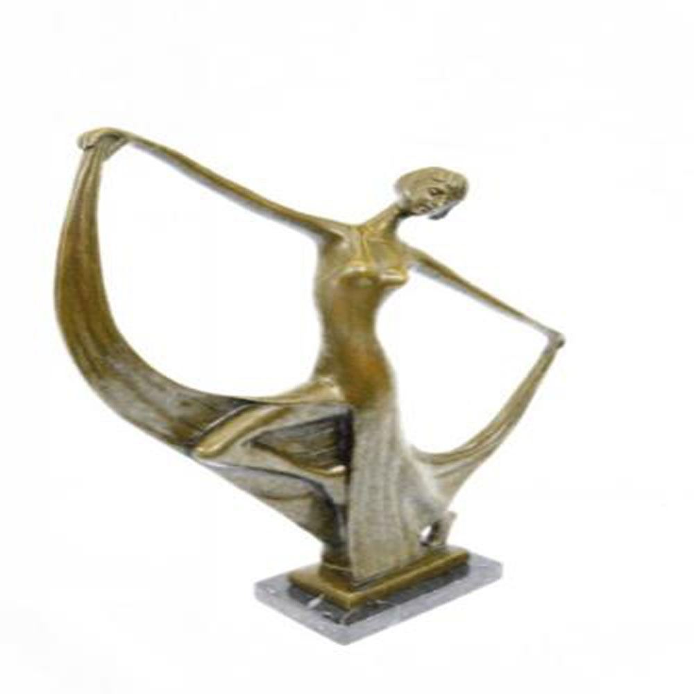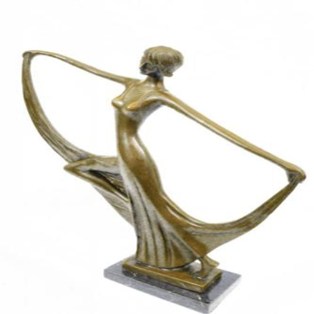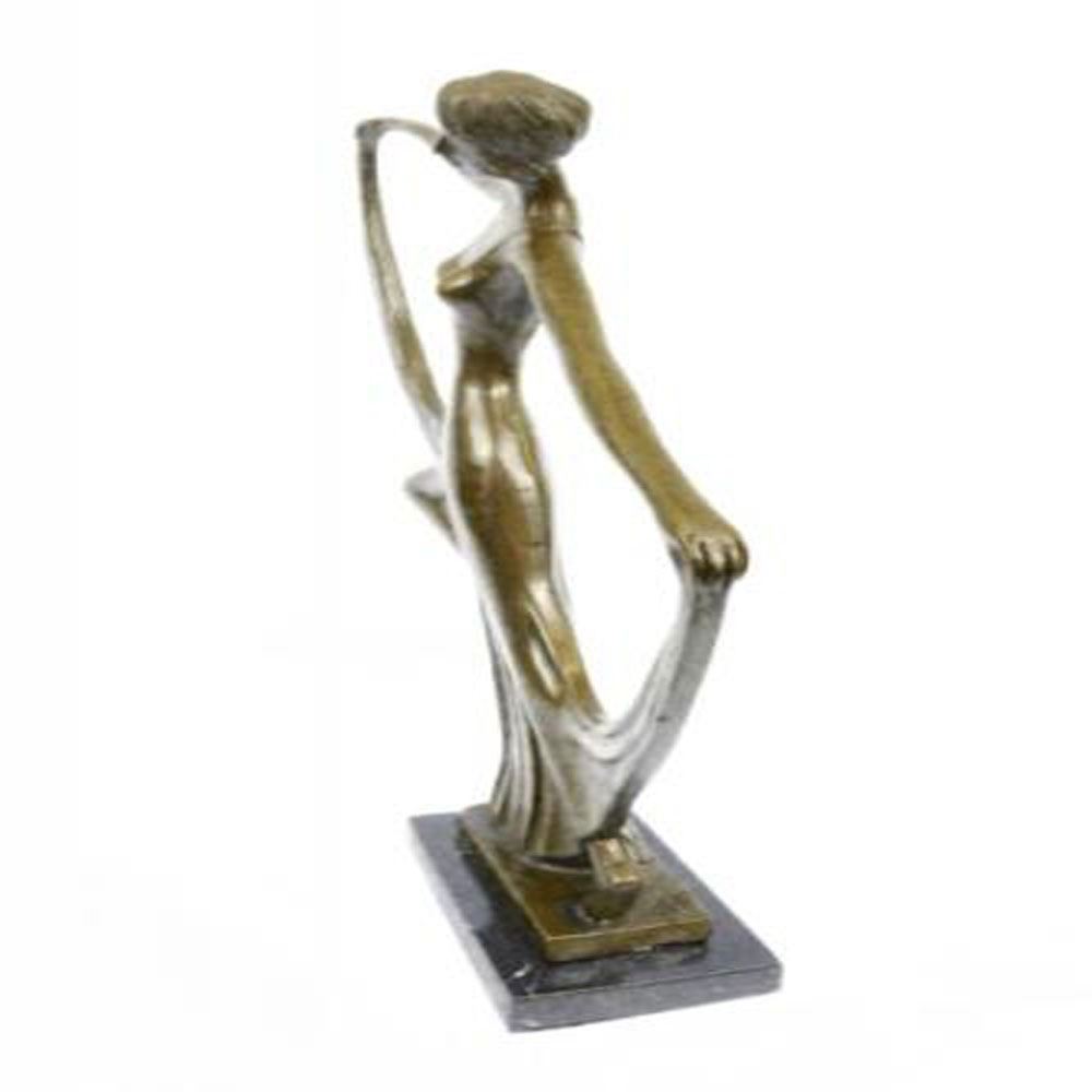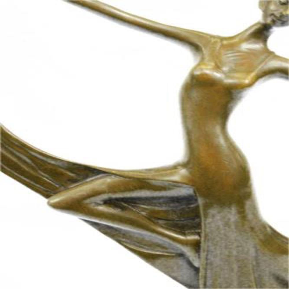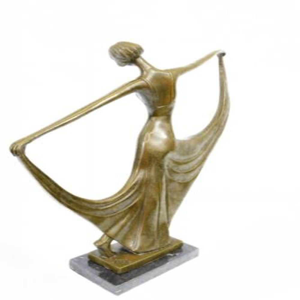 The lean and elegant figurine is captured in riddance. Her two dimensional appearance seems as though she was removed from a wall carving creating an interesting abstract illusion. She fans out the garments of her ankle length dress amplifying the motion of her dance. Her right knee bends peaking out of the slit in her dress. She closes her eyes with the emotion of her dance as she serenely smiles. The dancer was cast using the age old technique of lost wax casting and it is stained in a brown patina and mounted upon a marble base. Bronze Dimensions with Marble Base: Height 13 X Width 12 inches. Weight: 8 LBS.