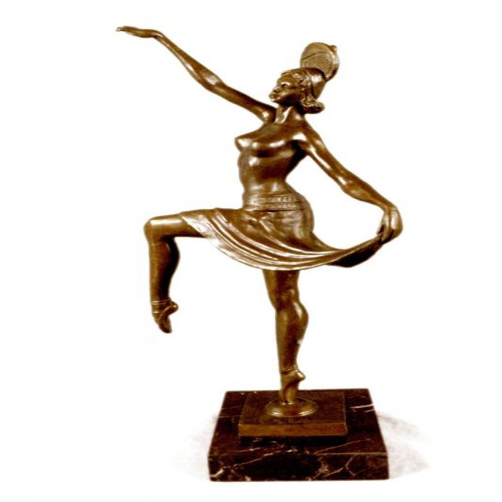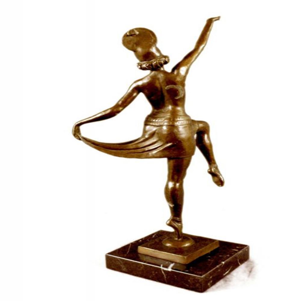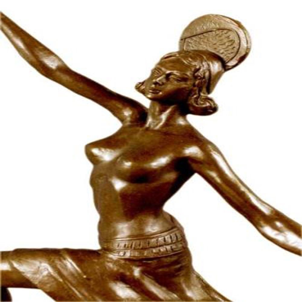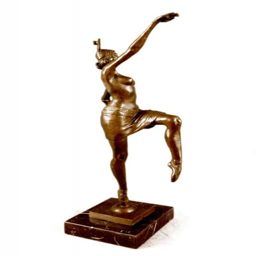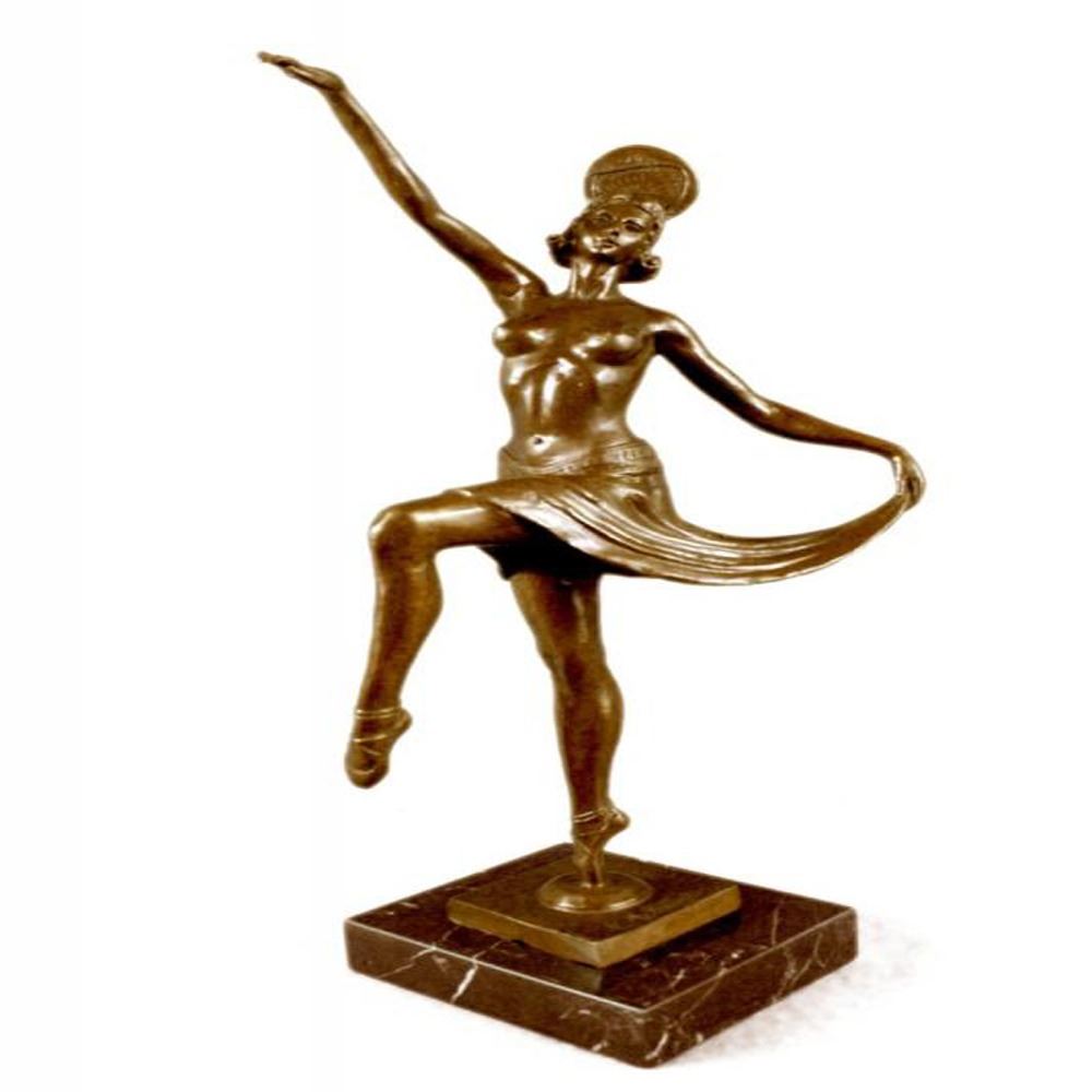 This spectacular early 20th c French reproduction bronze was made by Henri (Enrique) Molins-Ballester (1893-1958). It depicts an iconic Art deco dancer in motion with one of her legs kicked upward and one hand to each side. The nude dancer wears only an undergarment, yet exhibits such grace in her movement. Notice the fine detail to her face and the subtle muscular definition of her body - her stomach, knees, back, and spine. Her bobbed hairdo is certainly reminiscent of the Flapper style. The bronze is patinated with a handsome brown color. The sculpture is further enhanced by the tiered square base, combining marble. Dimensions: Height 16 X Width 10 inches. Weight: 8 LBS.