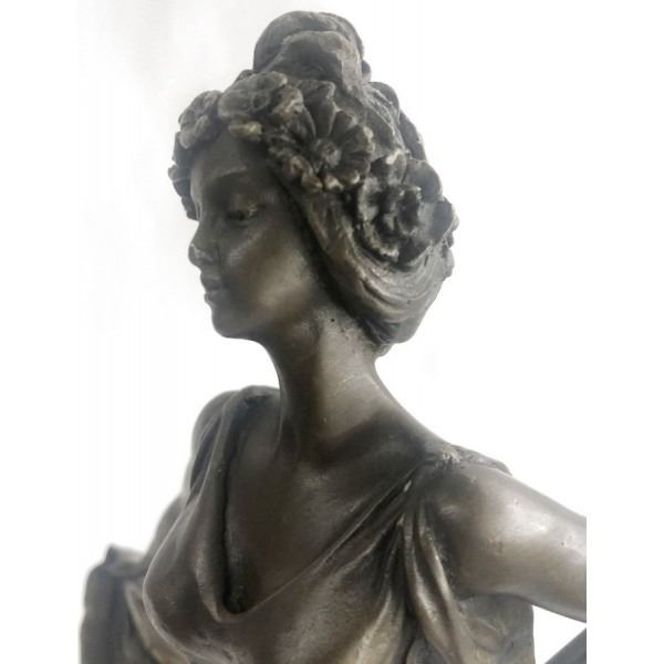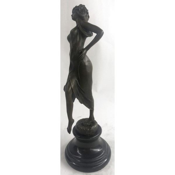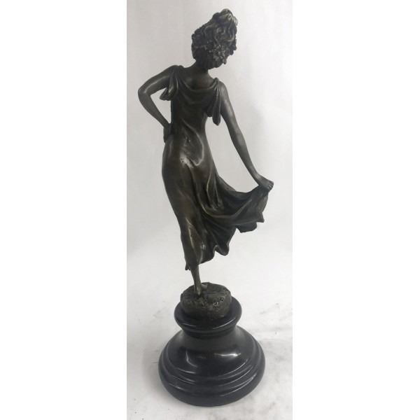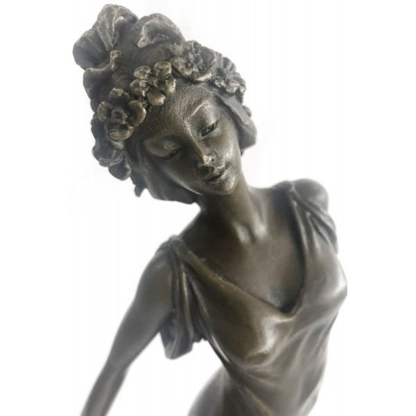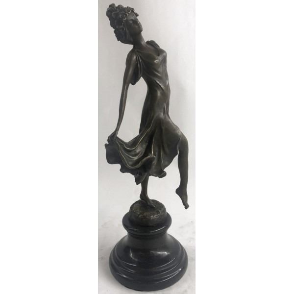 This astonishing piece of art is a magnificent art deco figurine. Her arms are outstretched to her side as she stands on one leg and balances, she is careful not to make a mistake during her performance. She has extremely strong legs and arms adding to her uniqueness. She wears a special dress that exposes her legs giving her a very sexy look. Her one leg is out to the side and helps break up the sculpture giving it more dimension. She is an exquisite piece of art and holds a true art deco feel. This sculpture was cast using the Lost Wax Method and has a two-tone brown patina and mounted on a marble base. Dimensions: Height 16 X Width 6 inches. Weight: 10 LBS.