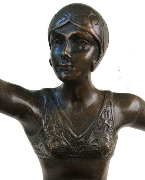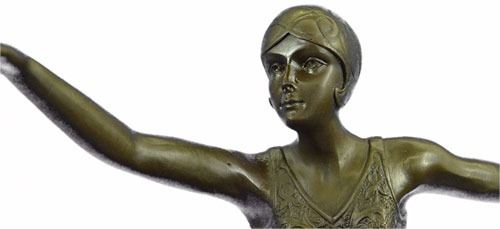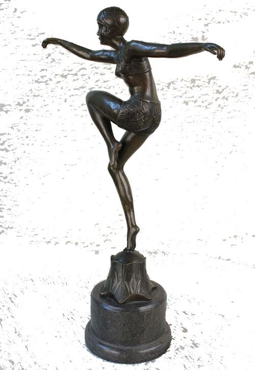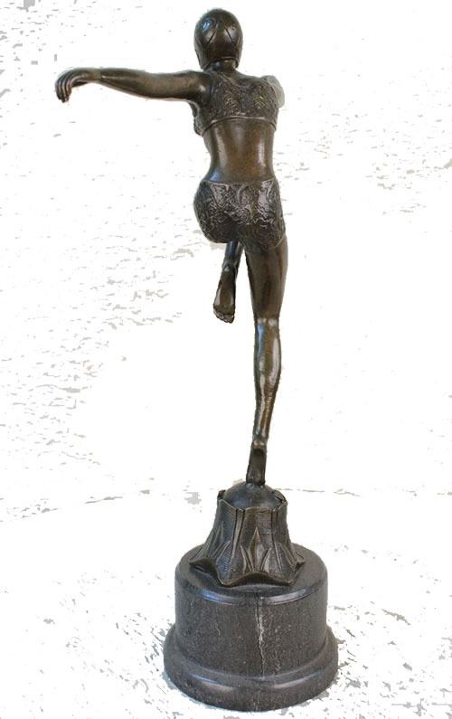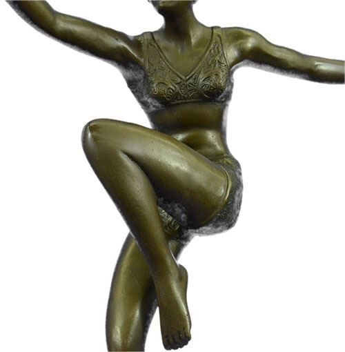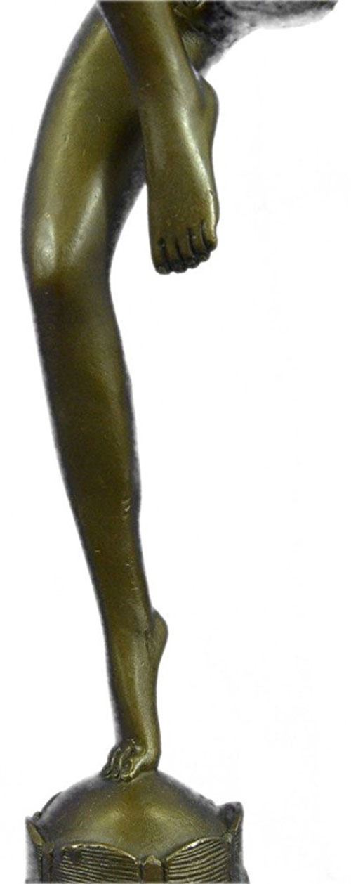 This is a fantastic quality bronze sculpture of a dancer lady. This large heavy bronze is entitled Phoenician Dancer and was sculpted. Inspiration of the Egyptian art in this piece. She extends her arms out and poses in a theatrical pose. She stands on her toes and dances with her legs close together and bent. This is an extremely detailed piece right down to the tone of her stomach muscles. This sculpture was handmade and has a brown patina. Bronze Dimensions with Marble Base: Height 19 X Width 12 inches. Weight: 12 LBS. Inventory: 43Y26634