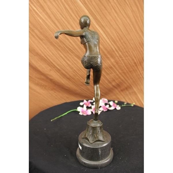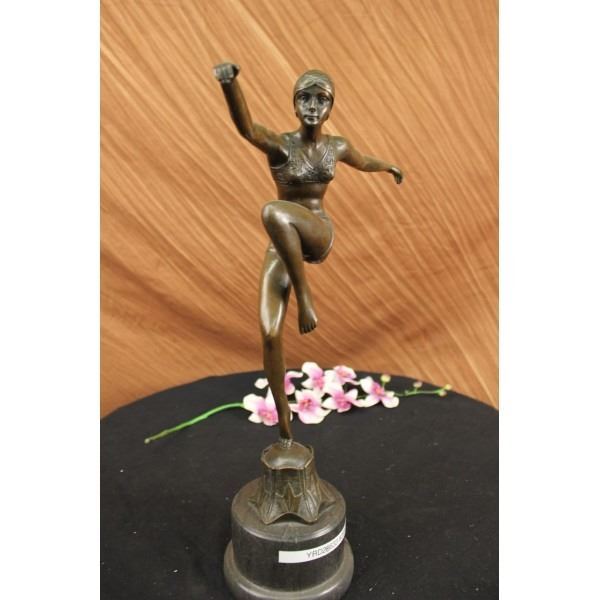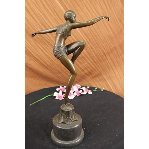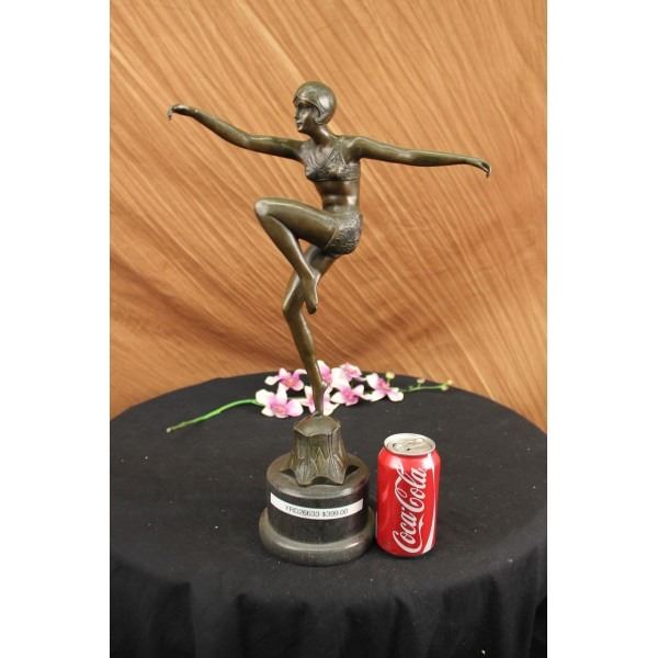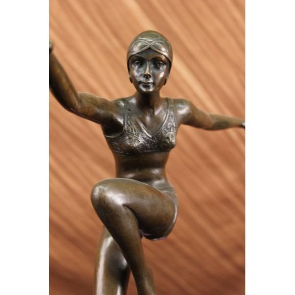 This is a fantastic quality bronze sculpture of an art deco dancing lady. This large heavy bronze is entitled Phoenician dancer. She extends her arms out and poses in a theatrical pose. She stands on her toes and dances with her legs close together and bent. This is an extremely detailed piece right down to the tone of her stomach muscles. This sculpture is handmade and has a brown patina. It is mounted on an art deco styled black marble base. Bronze dimensions with marble base: Height 19 X Width 12 inches. Weight: 12 lbs. Please Note: This is a reproduction bronze sculpture from the original molded and signed. This featured bronze sculpture is a recast after the original, and has been done recently. This 100% bronze sculpture is an abstract piece certain to be a conversation piece.Please Note: This is a reproduction bronze sculpture from the original molded and signed. This featured bronze sculpture is a recast after the original, and has been done recently. This 100% bronze sculpture is an abstract piece certain to be a conversation piece.