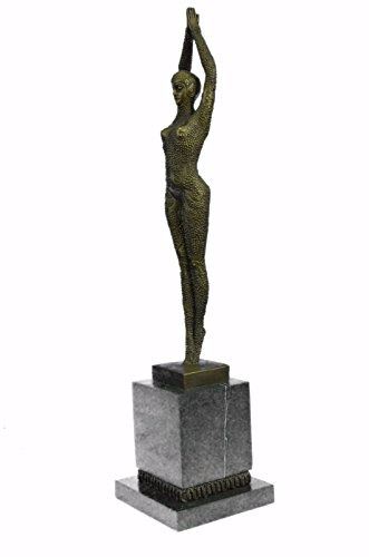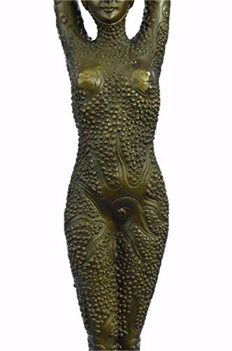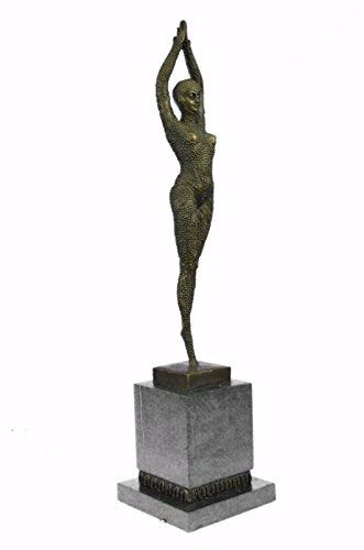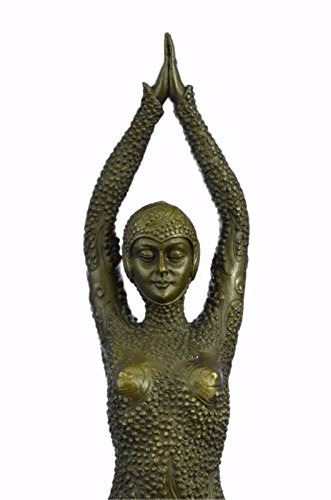Another Stunning Piece To Collect Decorate Only The Highest Quality In Patina Is Used To Last Generations. The Brown Flesh Tones Are Actually The Amazing Applications Of A Patina Blend Over Bronze. She Stands Tall In A Full Body Beaded Suit That Covers Her Head To Toe, She Also Wears A Matching Hat. She Has This Elegant Stance And Her Hands Meet Above Her Head, As If She Is Meditating With Her Eyes Close And Her Legs Crossed One In Front Of The Other and Casted Using The Lost Wax Method. Notice The Authenticity Of This Recast Of The Sculpture By Examining The Head Torso And Hand Positions. Bronze dimensions with marble base: Height 19 X Width 5 inches. Weight: 10 lbs.Please Note: This is a reproduction bronze sculpture from the original molded and signed. This featured bronze sculpture is a recast after the original, and has been done recently. This 100% bronze sculpture is an abstract piece certain to be a conversation piece.Please Note: This is a reproduction bronze sculpture from the original molded and signed. This featured bronze sculpture is a recast after the original, and has been done recently. This 100% bronze sculpture is an abstract piece certain to be a conversation piece.