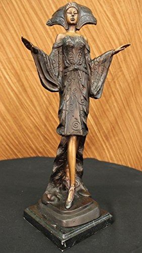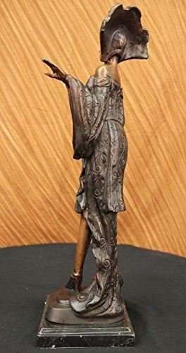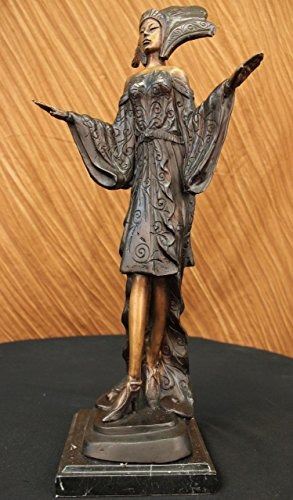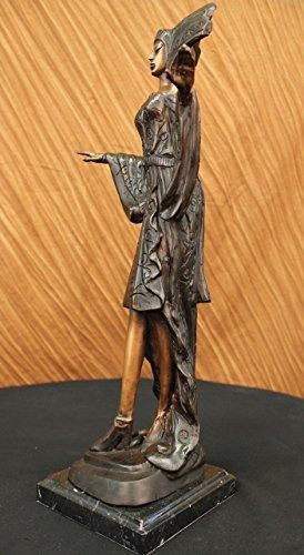 She Is Most Certainly Not Another Brick In The Wall, But Here To Define Herself As A Timeless Individual. She Stands Tall With Impeccable Posture, Draped In A Delicate, Defined Dress, With A Detailed, Matching Head Piece. The Tail Of Her Dress Gently Swarms The Surrounding Area By Her Feet, Which Are Covered By Sophisticated Heels To Put The Finishing Touches On Her Effeminate Appearance. Her Strong, Yet Delicate Hands Have The Power To Halt Any Man Who Dare Think He Is Worthy Of Entering Her Presence, Along With The Calm, Blank Stare In Her Face Which Defines Her Serious Demeanor. The Statue Is Made Completely Of Lost Wax, With A Crisp Patina Texture, Placed Upon Sleek Marble Base. Bronze dimensions with marble base each: Height 20 X Width 9 inches. Weight: 12 lbs.Please Note: This is a reproduction bronze sculpture from the original molded and signed. This featured bronze sculpture is a recast after the original, and has been done recently. This 100% bronze sculpture is an abstract piece certain to be a conversation piece.Please Note: This is a reproduction bronze sculpture from the original molded and signed. This featured bronze sculpture is a recast after the original, and has been done recently. This 100% bronze sculpture is an abstract piece certain to be a conversation piece.