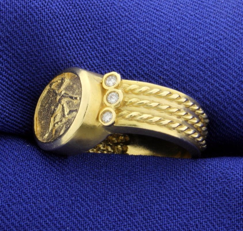 In 10K yellow gold, there is an image of a dancer. Also contains six .03ct diamonds. Size 6 3/4 9.2g