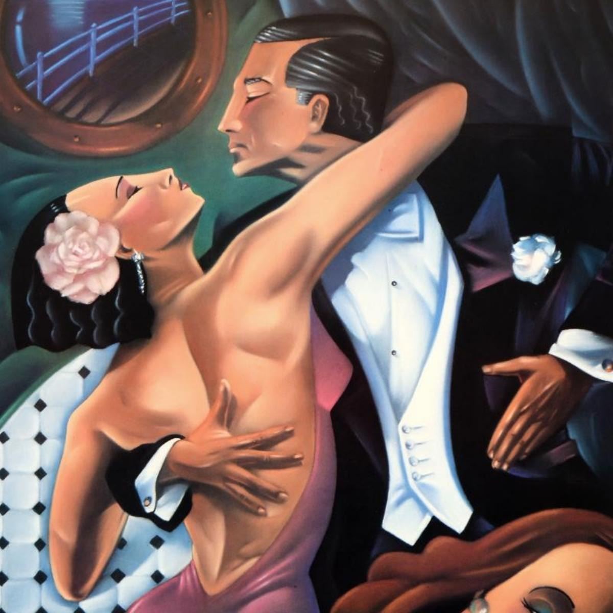 "Dancer (Tango)" is a limited edition lithograph on paper by Ted Young, numbered and hand signed by the artist. Measures approx. 23" x 35" (with border), 20" x 28" (image).