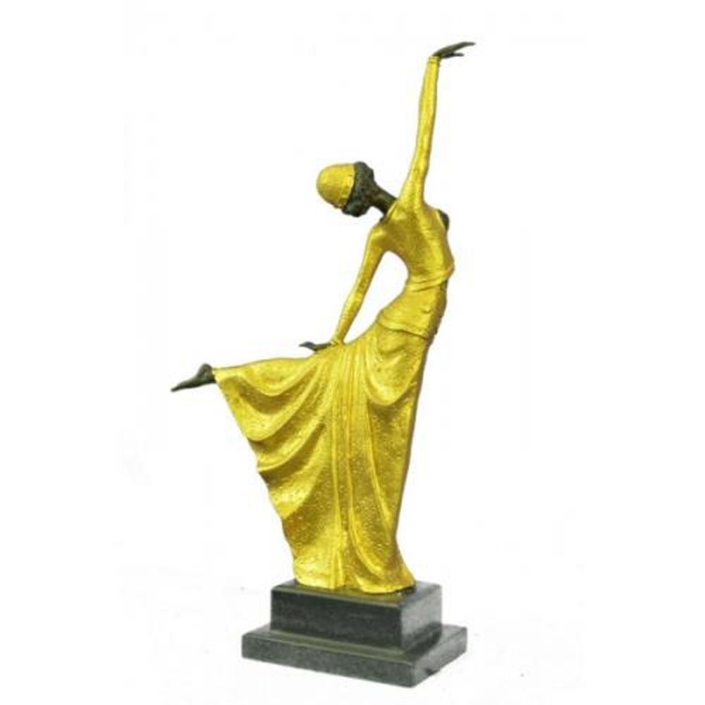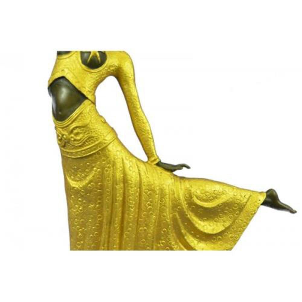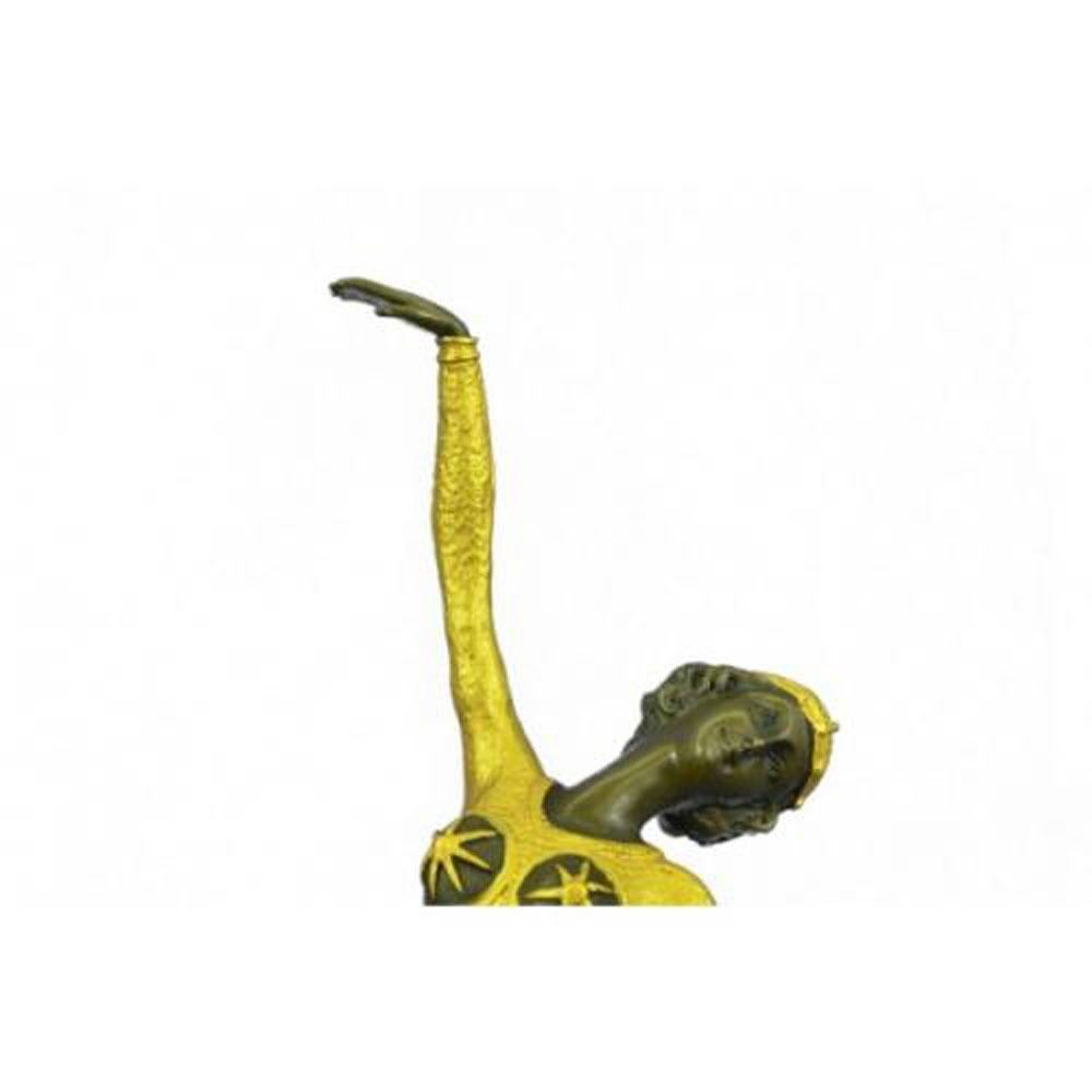An elegant dancer extends her long leg out in an arabesque. Her long vibrant dress extends with her. She raises softly and gently to the sky. Her head tilts along with the movement. This a very beautiful piece that pays tribute to the art of dance. The sculpture stands on a marble base. The lost wax method was used to create this sculpture. Bronze Dimensions with Marble Base: Height 17 X Width 13 Inches. Weight: 9 LBS.