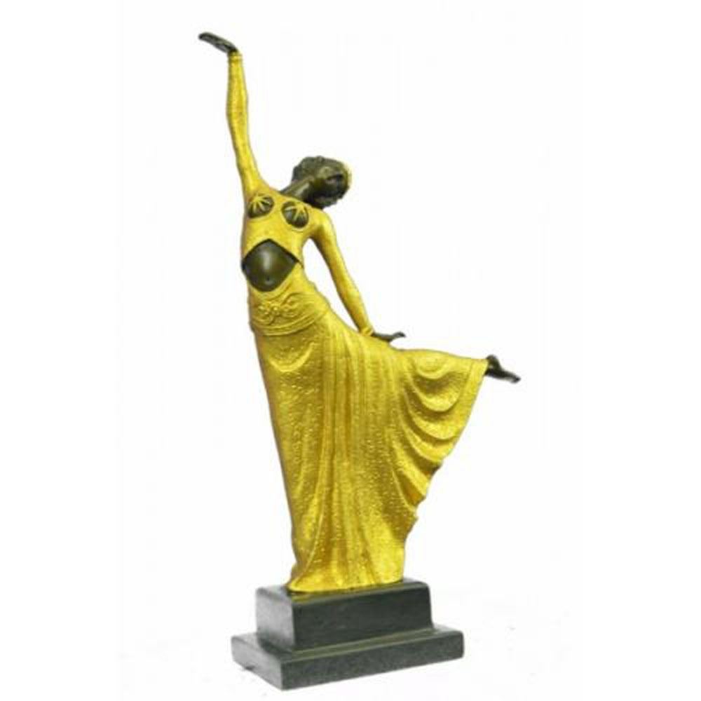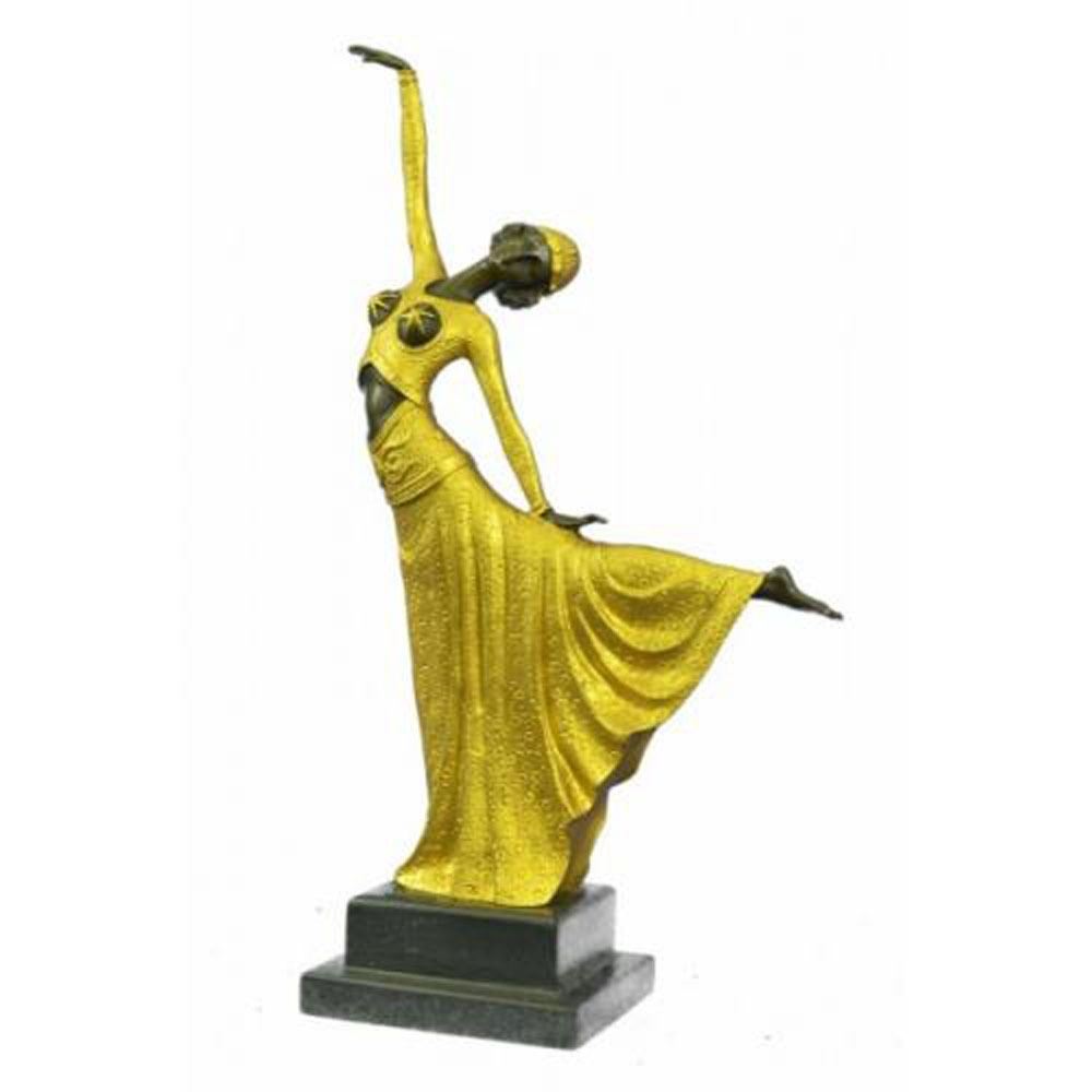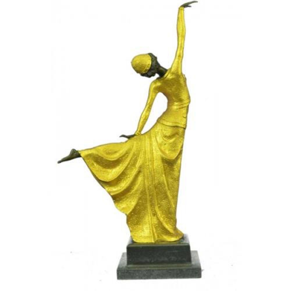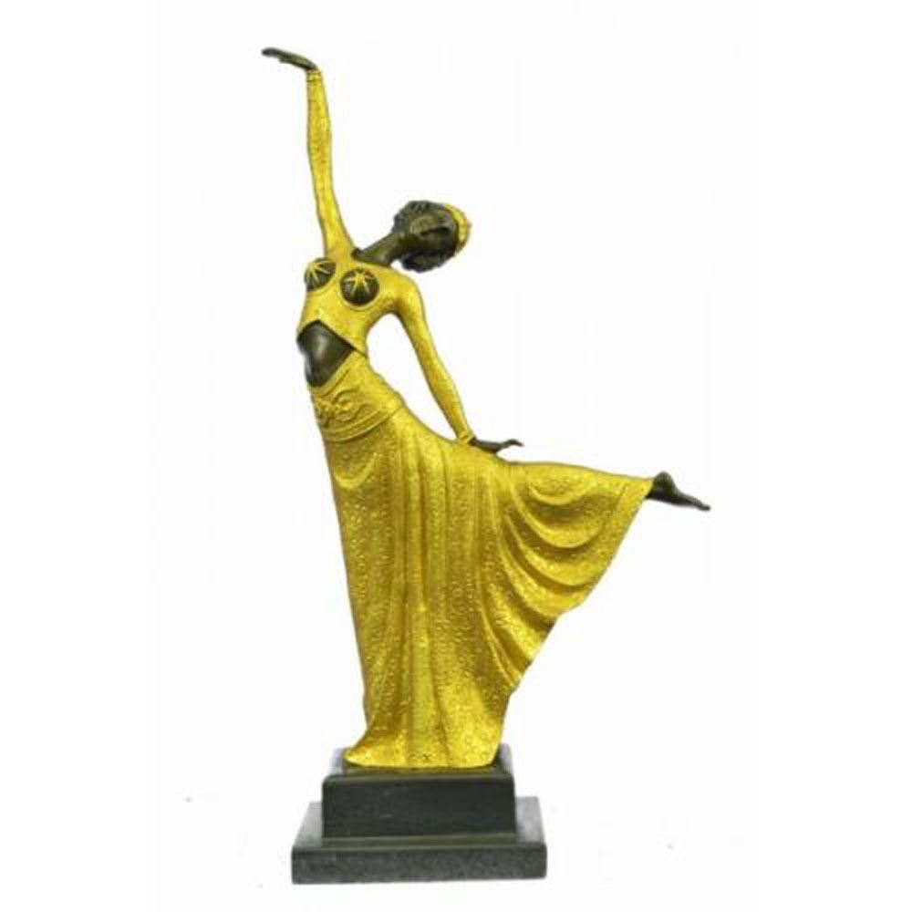 An elegant dancer extends her long leg out in an arabesque. Her long vibrant dress extends with her. She raises softly and gently to the sky. Her head tilts along with the movement. This a very beautiful piece that pays tribute to the art of dance. The sculpture stands on a marble base. The lost wax method was used to create this sculpture. Bronze Dimensions with Marble Base: Height 17 X Width 13 Inches. Weight: 9 LBS.