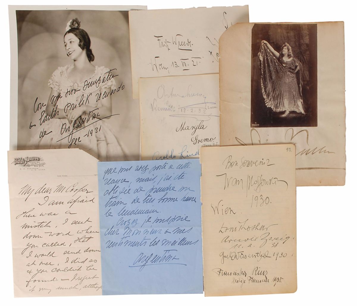 Collection of eight items, including: an ALS and large ink signature on a sheet beneath an affixed portrait by Loie Fuller; a signed photo and ALS by La Argentina; an album page by famed Russian dancer Anna Pavlova and organ builder Fritz Wrede, with an AMQS by Bruno Granichstaedten on the reverse; an album page signed by child dancer Maryla Gremo, author Diana Manners, dancer Lucy Kieselhausen, conductor Arturo Lucon, and tenor Aroldo Lindi; an album page signed by dance pioneer Grete Wiesenthal, author Arnold Zweig, and actor Emil Jannings; and a book signed by Jose Greco. In overall very good to fine condition.
