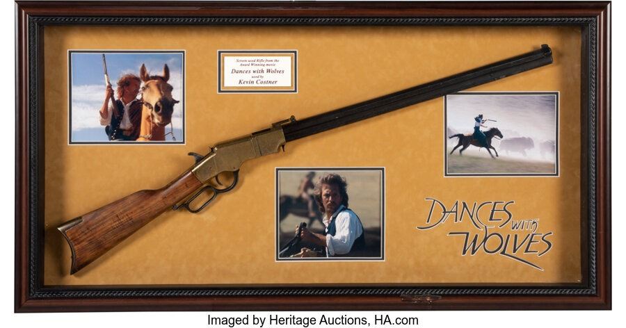 Dances With WolvesKevin Costner Screen Used Rifle (1990). A rifle used onscreen by the film's director and star, Kevin Costner, matted and framed in a hefty shadow box. The epic Western, released in the fall of 1990, would go onto be a huge box office success (over $400 million worldwide) and won seven Academy Awards (including Best Picture and Best Director). This rifle (matted with three pictures from the film with Costner holding the rifle, as well as a plaque) is housed in a 3" x 25" x 48" shadow box. Overall, in Very Good Plus condition with water damage on the backing paper, along with tears and creasing. The acrylic has marks and scratches. The rifle itself has scuffs in various spots. COA from Heritage Auctions.