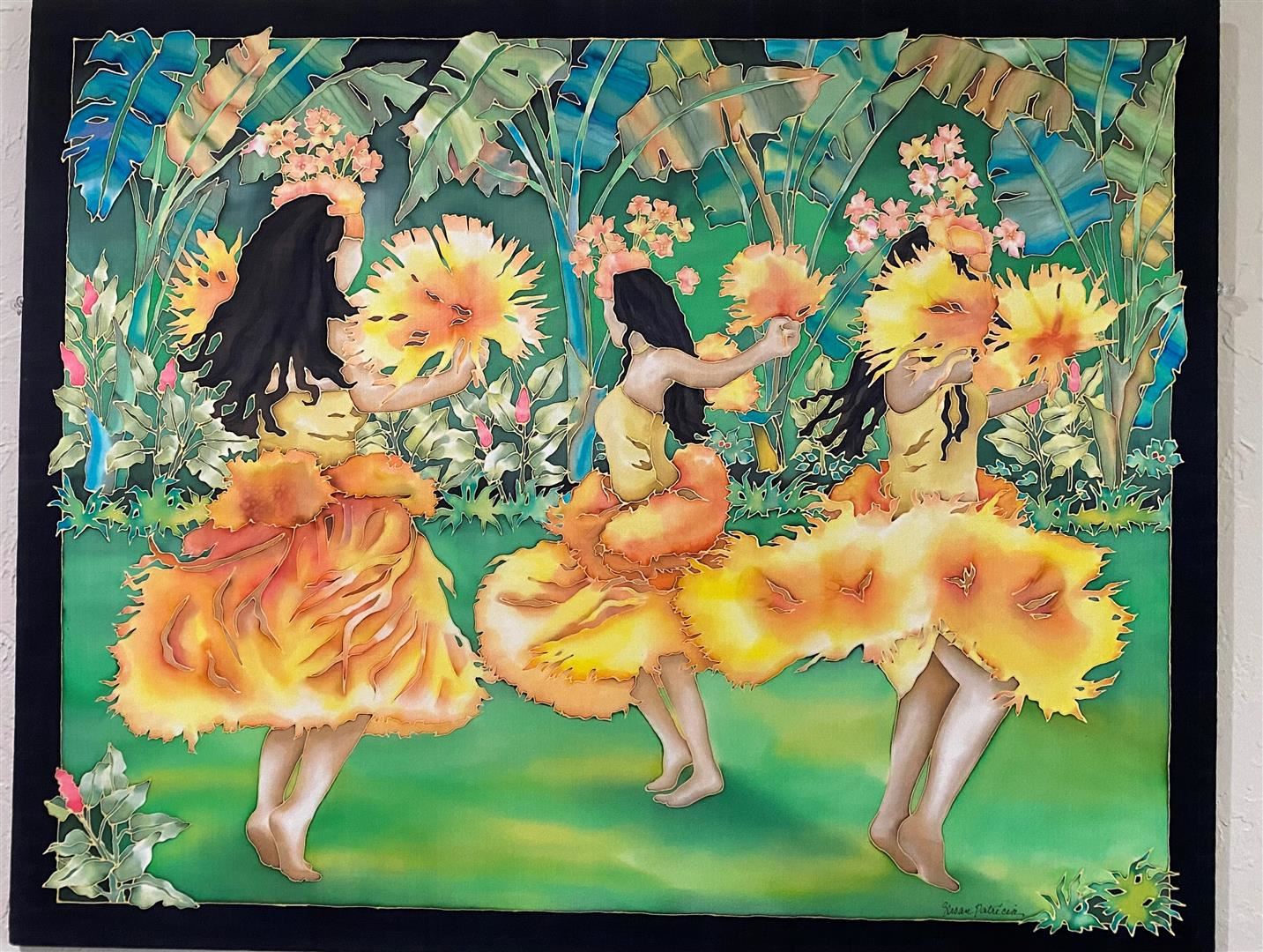 "Dancing Girls" practice their Hula on green grass. An original on silk, 30" x 24.25" by Hawaii's Susan Patricia