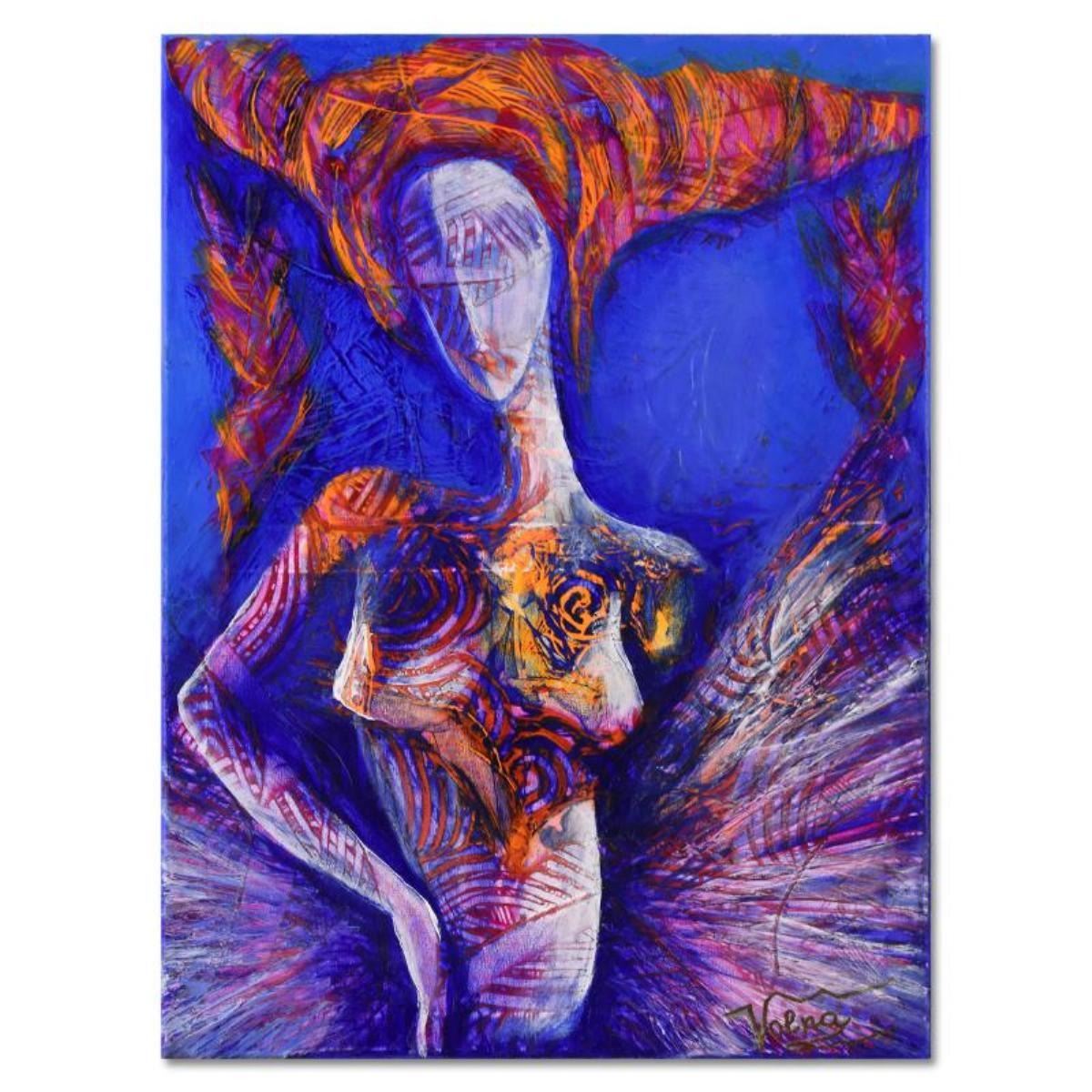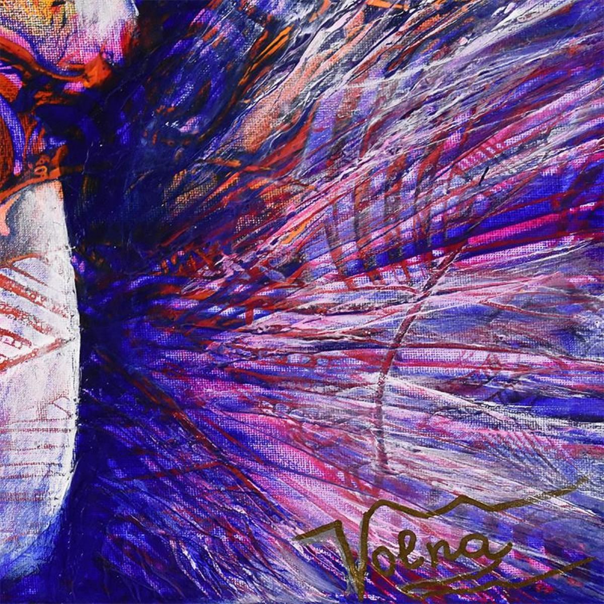 "Looking at the Sky" is an original acrylic painting on stretched canvas by Nadia Volna, hand signed by the artist. This piece is painted with light-reactive black light paint that reveals brilliant colors when viewed under incandescent light. This piece comes with a blacklight flashlight (batteries not included). Includes Letter of Authenticity. Measures approx. 18" x 24" (image).