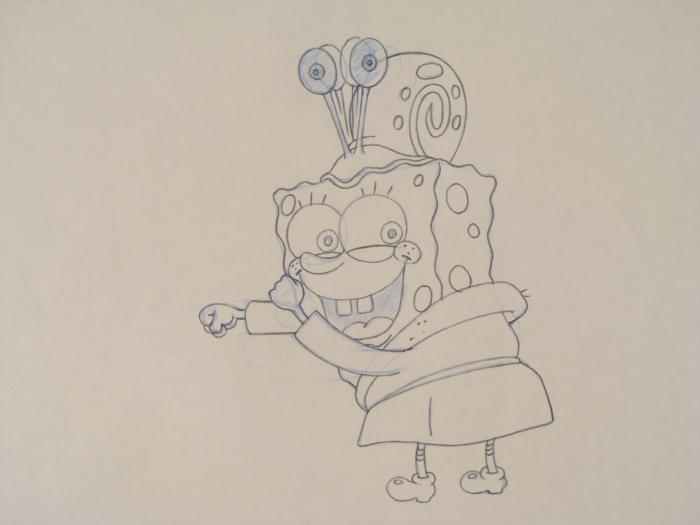 This original animation art pencil drawing was done for SpongeBob Squarepants. The notations are of numbers and letters. In this drawing, SpongeBob is on the brink of becoming a dancing star.The story takes place under the deep blue sea in Bikini Bottom, where SpongeBob resides. SpongeBob, who is a yellow, porous sponge, is your typical happy-go-lucky character, as he is always cheerful and enjoys making people laugh. Patrick Star, SpongeBob's neighbor who is a starfish, is your average children's show idiot, as he boasts knowing nothing and is often getting himself into ridiculous situations. Between the homes of these two lies the home of the miserable Squidward, a squid, who is known for being grouchy and playing tricks on SpongeBob and Patrick. Both SpongeBob and Squidward work at the Krusty Krab, a fast food business run by the greedy money-loving Mr. Krabs, a crab, the arch rival of the evil, possibly misunderstood, Plankton. Another neighbor, Sandy Cheeks, an athletic squirrel who normally wears an astronaut's space suit, was introduced in "Tea at the Treedome." She spends most of her time inventing and experimenting. Original "rough" animation drawing, in non-photo blue and black pencil. Spongebob's mouth and Gary's eyes are shaded in with blue pencilOverall size is a 12-field drawing that is 10 1/2" × 12 1/2" Excellent condition Traditional animation is a multi-step process which includes various types of art techniques. Drawings are a key part of the process, in which the animator creates the design and movement of the characters. Drawings are then transferred onto acetate cels (by hand-inking and/or photo copying) to create a production cel, which is then hand painted on the back side, using paint colors chosen and approved by the creator of the series. This drawing is ready to framed and matted. The animator's notations are shown at the bottom of the drawing. Gary's eyes are shown at the bottom right of the drawing in non-photo blue.