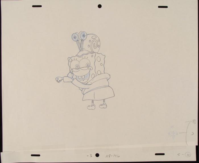 This original animation art pencil drawing was done for SpongeBob Squarepants. The notations are of numbers and letters. In this drawing, SpongeBob is on the brink of becoming a dancing star.The story takes place under the deep blue sea in Bikini Bottom, where SpongeBob resides. SpongeBob, who is a yellow, porous sponge, is your typical happy-go-lucky character, as he is always cheerful and enjoys making people laugh. Patrick Star, SpongeBob's neighbor who is a starfish, is your average children's show idiot, as he boasts knowing nothing and is often getting himself into ridiculous situations. Between the homes of these two lies the home of the miserable Squidward, a squid, who is known for being grouchy and playing tricks on SpongeBob and Patrick. Both SpongeBob and Squidward work at the Krusty Krab, a fast food business run by the greedy money-loving Mr. Krabs, a crab, the arch rival of the evil, possibly misunderstood, Plankton. Another neighbor, Sandy Cheeks, an athletic squirrel who normally wears an astronaut's space suit, was introduced in "Tea at the Treedome." She spends most of her time inventing and experimenting. Original "rough" animation drawing, in non-photo blue and black pencil. Spongebob's mouth and Gary's eyes are shaded in with blue pencilOverall size is a 12-field drawing that is 10 1/2" × 12 1/2" Excellent condition Traditional animation is a multi-step process which includes various types of art techniques. Drawings are a key part of the process, in which the animator creates the design and movement of the characters. Drawings are then transferred onto acetate cels (by hand-inking and/or photo copying) to create a production cel, which is then hand painted on the back side, using paint colors chosen and approved by the creator of the series. This drawing is ready to framed and matted. The animator's notations are shown at the bottom of the drawing. Gary's eyes are shown at the bottom right of the drawing in non-photo blue.