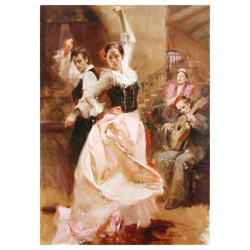 "Dancing in Barcelona" is a limited edition giclee on stretched canvas that has been hand-embellished by Pino himself, PP numbered and hand signed by Pino (1939-2010). Includes Certificate of Authenticity. Measures approx. 48" x 34" (image). Please allow 5 additional business for items that include canvas stretch or framing.