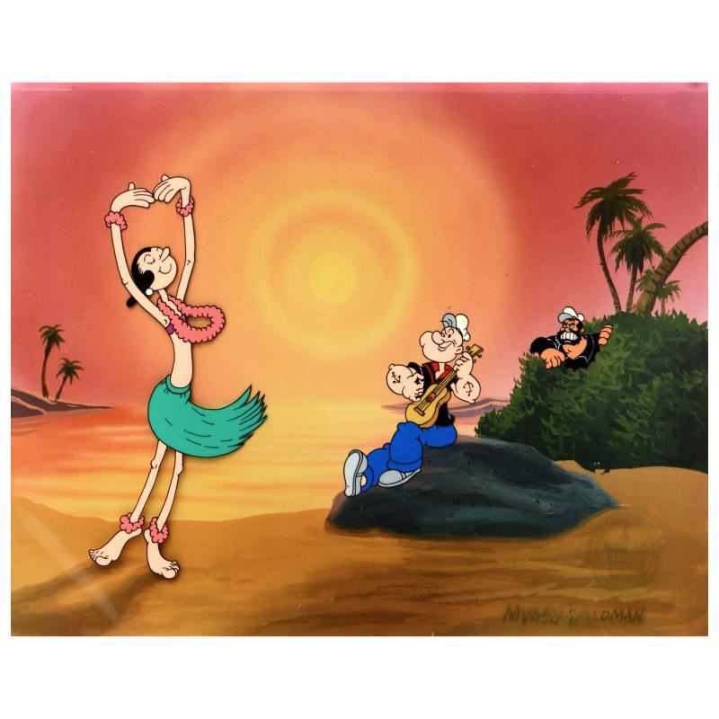 "Dancing on the Beach" is a limited edition hand inked and hand painted animation cel with background, numbered and hand signed by Myron Waldman (1908-2006). Includes Certificate of Authenticity! Measures approx. 14" x 12" (background with cel).