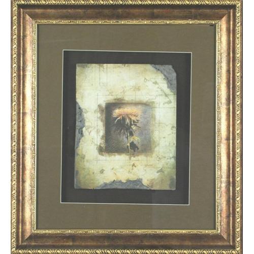 This is a very intriguing print that is mounted on a faux stone backing, making it appear to be a piece from a mural. This excellent, three dimensional print is outstandingly framed in a decorative, box frame that accents the colors of the picture and compliments the attractive matting. This unique print is set on a black background that highlights the shadows in the picture. The entire size of the piece is20.5?x18.5? and is an excellent buy.
