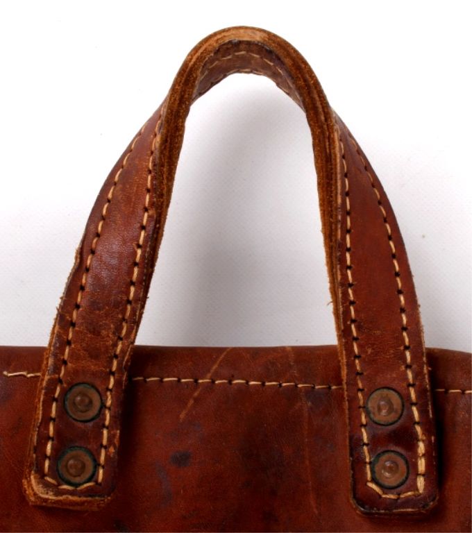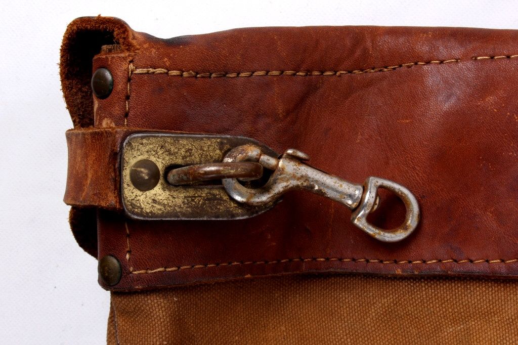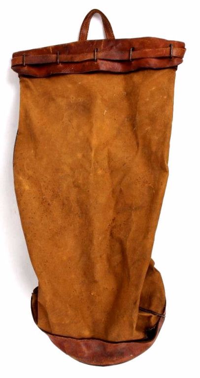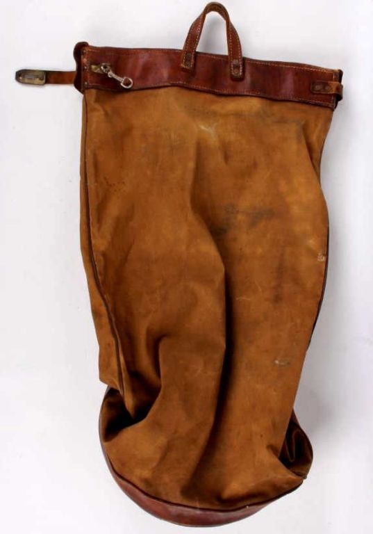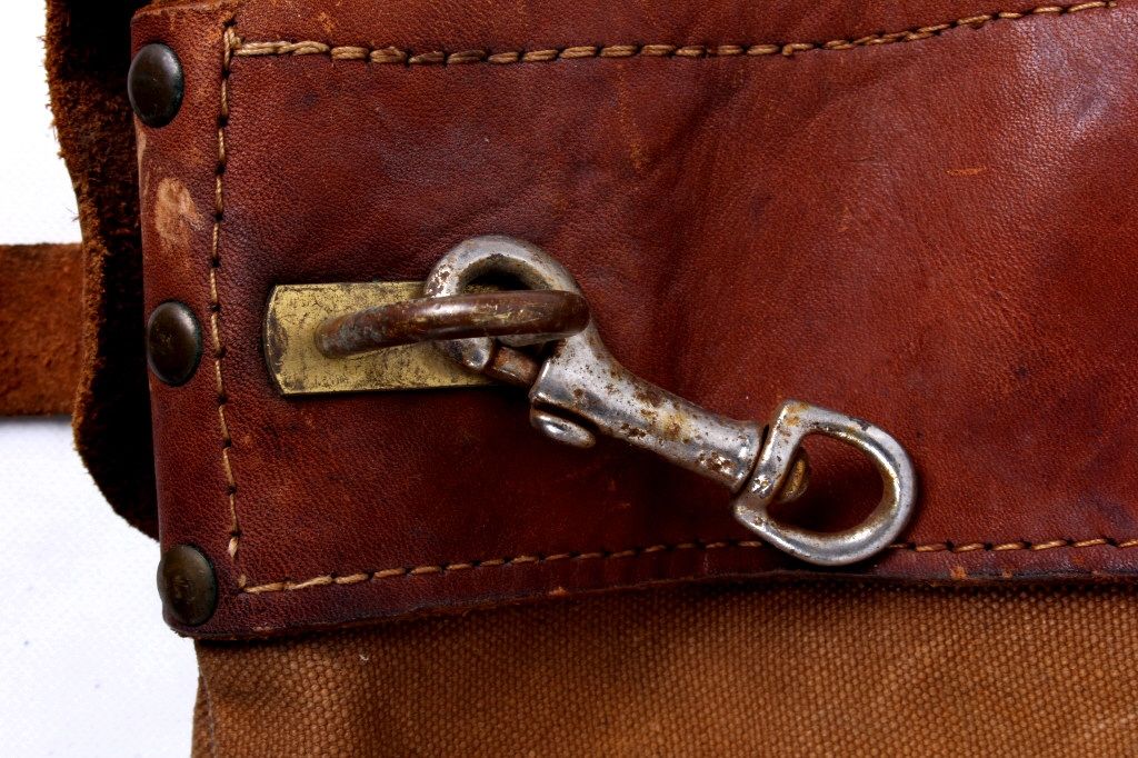 This is a Leather mail bag complete with leather locking strap. Canvas is in good condition and most of the leather is well sown on. Both leather handles are connected and can be still used. Measures 41"x18.5".