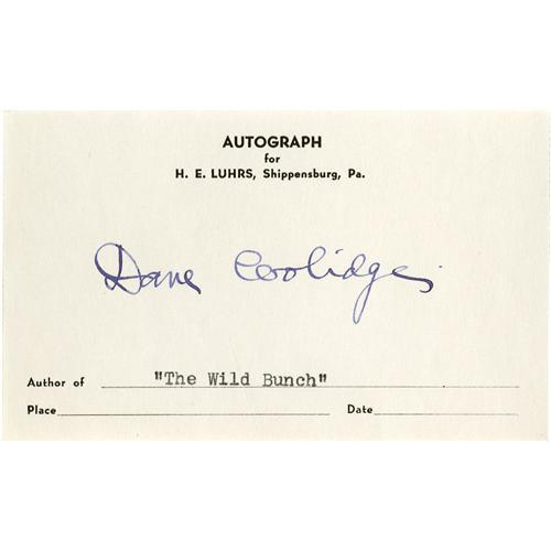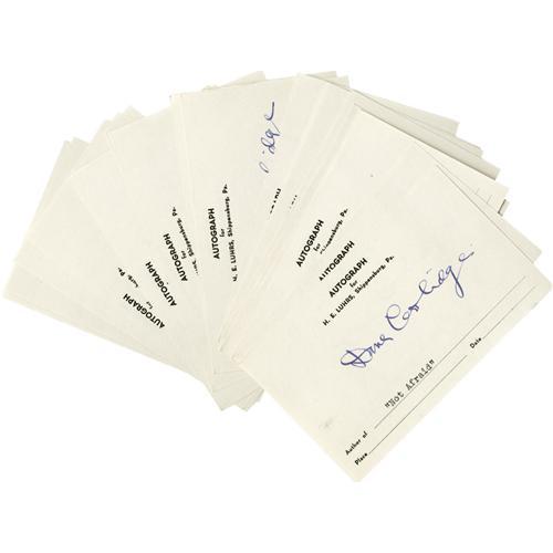 <B>Dane Coolidge Autograph Archive.</B></I> This lot is comprised of some 24 autograph pieces of the prolific writer of Westerns, as follows: 1) Dane Coolidge, Autograph Letter Signed, 1 page, 8.5" by 11", Berkeley, California, August 21, 1932. To H.E. Luhrs. Coolidge encloses multiple autographs and writes that, yes, he's the husband of Mary Roberts Coolidge with whom he wrote a book, "<I>The Navajo Indians</B></I>", considered the "<I>dernier cri</B></I>" on the subject. 2) 23 Signatures - 22 of Dane Coolidge and 1 of Dane Coolide and Mary Roberts Coolidge together - on 5" by 3" slips of paper on which is printed "Autograph for H.E. Luhrs, Shippenburg, Pa." with the added proviso that the signatory is the "Author of", this information being accomplished in typescript; hence each signed slip is for a different book. From the Henry E. Luhrs Collection.
