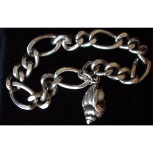 Rare Find! Chunky silver link chain bracelet with conch seashell charm. Seashell measures 1/2" X 7/8", bracelet measures 3/8" X 7 1/2" long and weighs 39.5 grams. Nicely detailed shell with pearl colored plastic bead and great patina. Cartouche near safety clasp is stamped Danecraft Sterling with register mark. Truly a hard to find piece of Danecraft art!