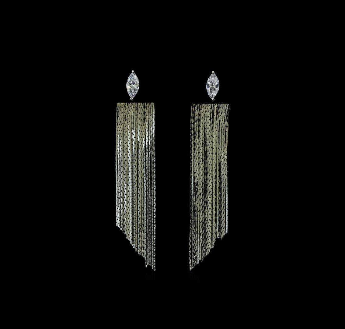 High end designer jewelry. Dangle Crystal Teardrop Earrings - Rhodium Plated. Rhodium Plated Post Set. Silver/ Clear. 3inches.