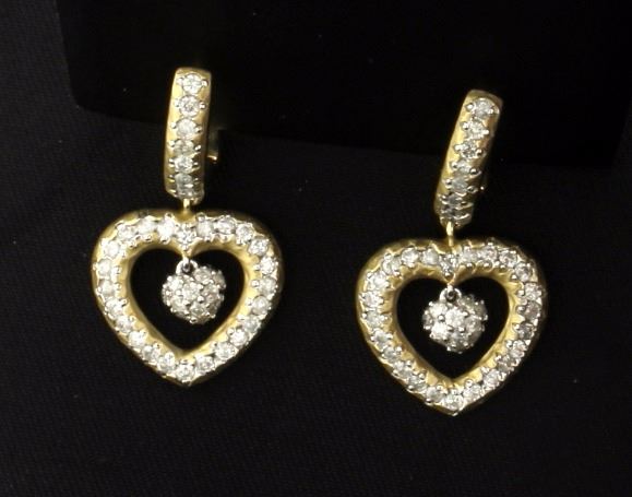 In 14k yellow gold these earrings have 1 ct TW of diamonds, I clarity/I color.  1 1/8 inch long.      4.8g