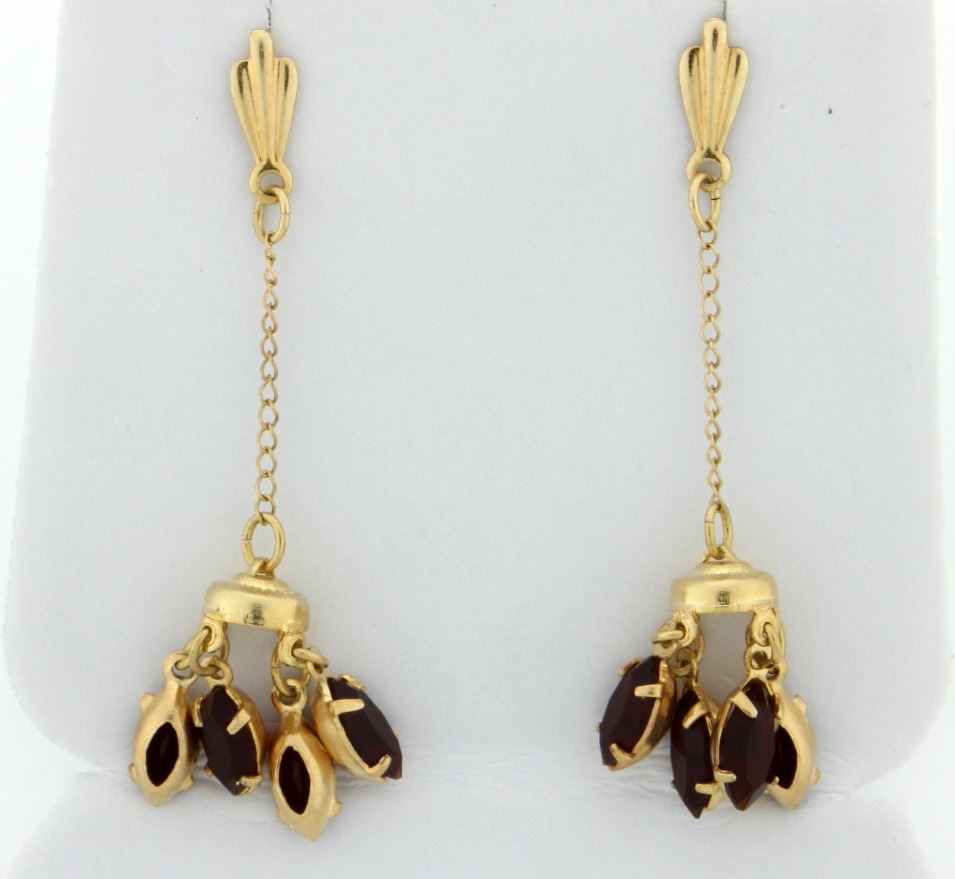Beautiful 14k yellow gold dangle style earrings with four beautiful Red Marquise cut stones in each earring. They measure 1 1/2" in length. 4.0g