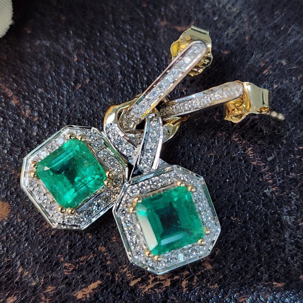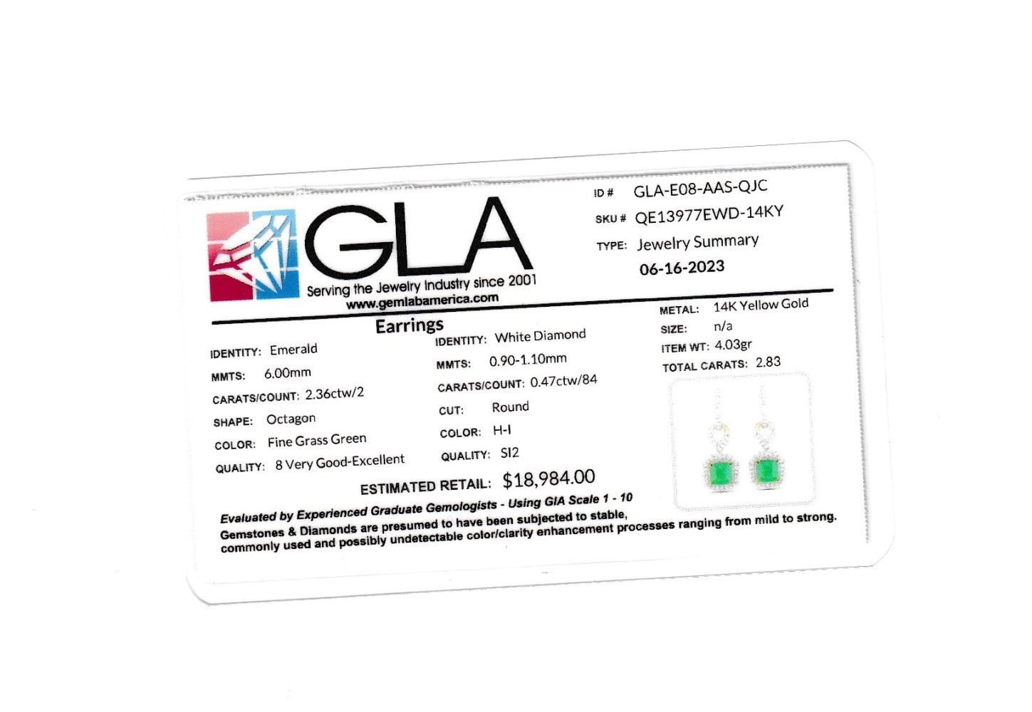 Genuine Emeralds and Earth-Mined Diamond Earrings.& nbsp; This pair of earrings could create a wonderful trio when matched with the previous ring an pendant!& nbsp; These 14 karat yellow gold earrings feature 2.36 carats of emerald-cut (with truncated corners - octagonal) glowing green emeralds that are prong-set with .47 carats of round, brilliant-cut, H-I color, Si2 clarity diamonds in the halos and looped ribbon-like drops that create the dangles.& nbsp; The earrings hang approximately 1.25& quot; and attach to the earlobe with posts and secure friction backs.& nbsp; This pair of earrings is certified and appraised for $18,984.00 estimated retail replacement value.& nbsp; CHECK OUT THE RING AND PENDANT IN LOTS 110 AND 111 FOR A MATCHING SET!!!
