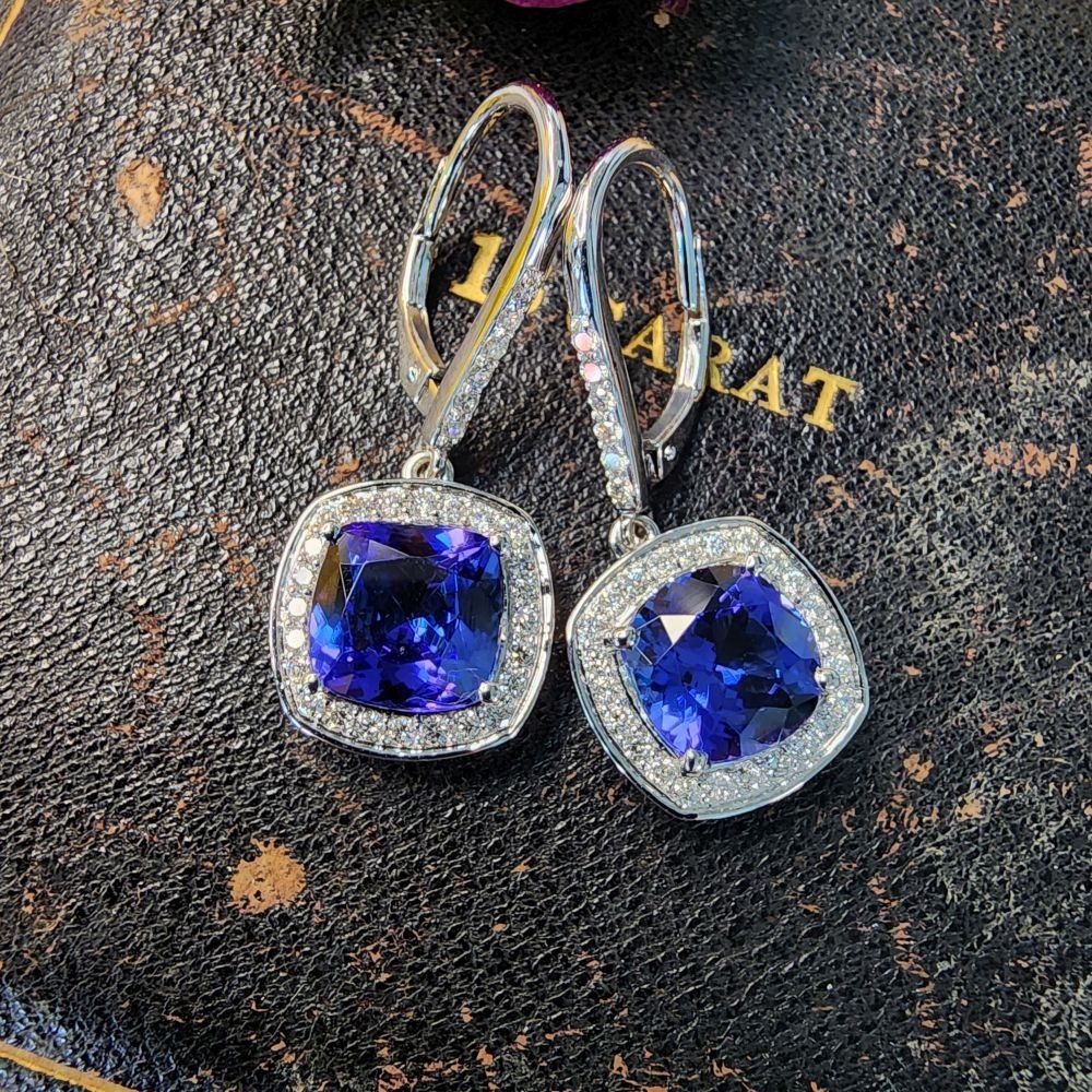 Genuine Tanzanite and Earth-Mined Diamond Earrings.& nbsp; This pair of 14 karat white gold earrings feature 5.50 carats of cushion-cut tanzanites that are prong-set with .60 carats of round, brilliant-cut, H-I color, SI2 clarity diamonds in the drops and surrounding frames.& nbsp; The earrings are approximately 1.25 & quot; long and attach to the earlobe with firm hooks and lever backs.& nbsp; The tanzanites have supportive back galleries and attach to the drops with fixed jump rings.& nbsp; These earrings are certified and appraised for $25,880.00 estimated retail replacement value. CHECK OUT THE MATCHING RING IN LOT 93!!!