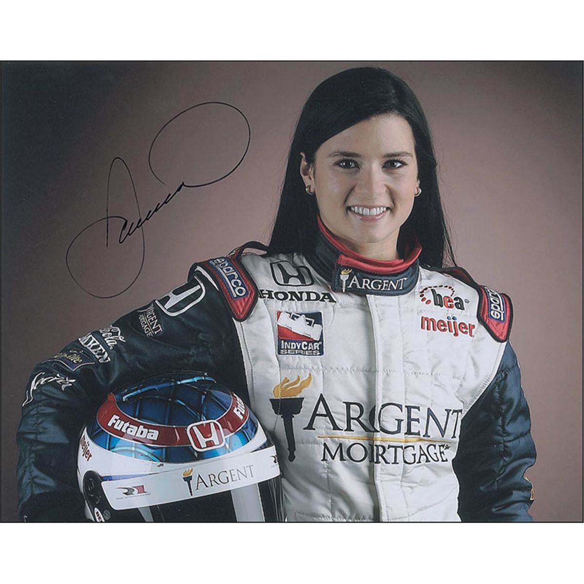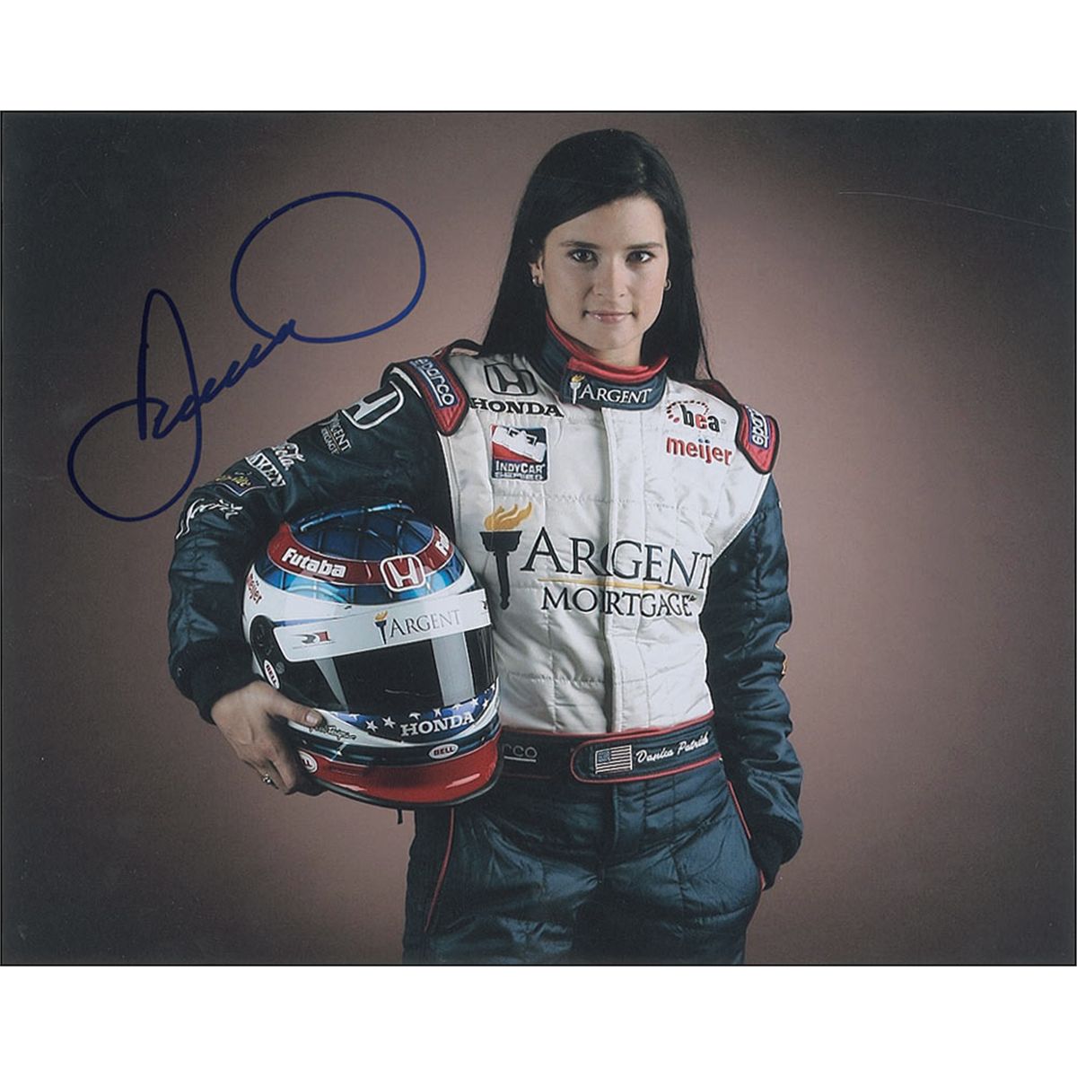 Two different color satin-finish 10 x 8 photos of Patrick posing in her racing suit, helmet under her arm, each signed in felt tip. In fine condition. Accompanied by a folder of info from the event at which the signatures were acquired.