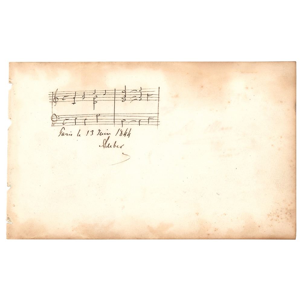 Nice AMQS on an off-white 7.5 x 4.5 album page, signed and dated below in ink, "Paris le 13 Juin 1844, Auber." Auber pens two bars of piano music from one of his compositions. In very good to fine condition, with light wrinkling, and staining along the edges.