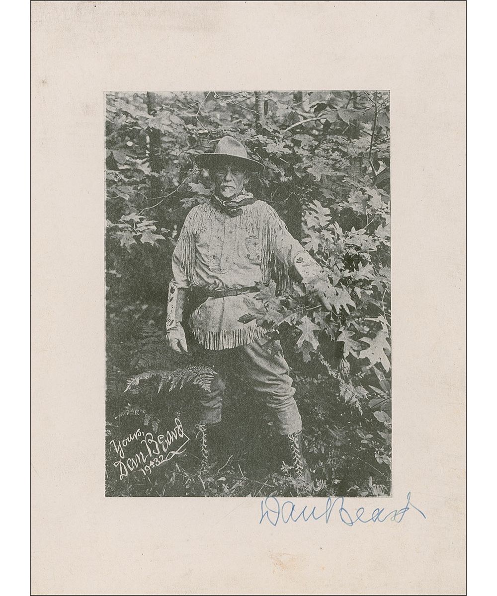 Wonderful photo of Daniel Beard in his element, camouflaged against the wilderness. 7'' x 9.5'' paperstock photo is signed ''Dan Beard'' in blue fountain pen on the photo's border. Beard is the founder of the ''Sons of Daniel Boone'' which merged with the Boy Scouts when the latter was founded in 1910. Near fine condition.