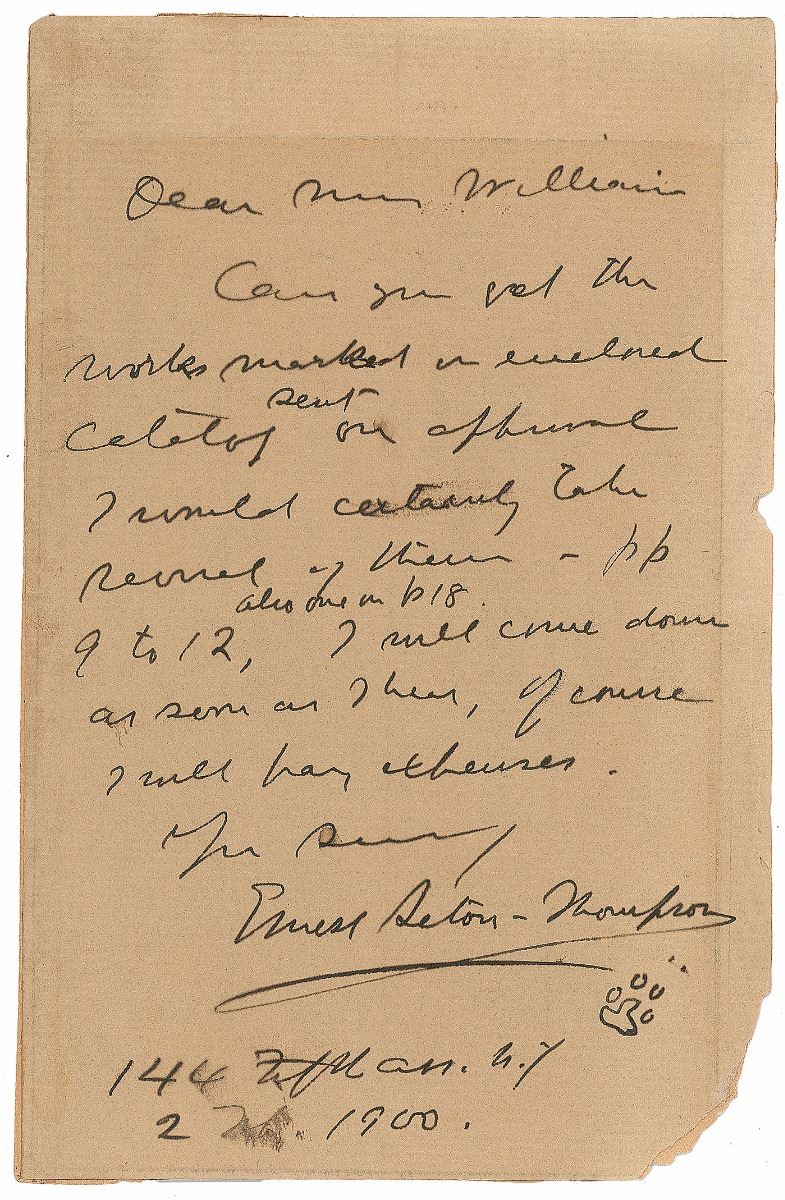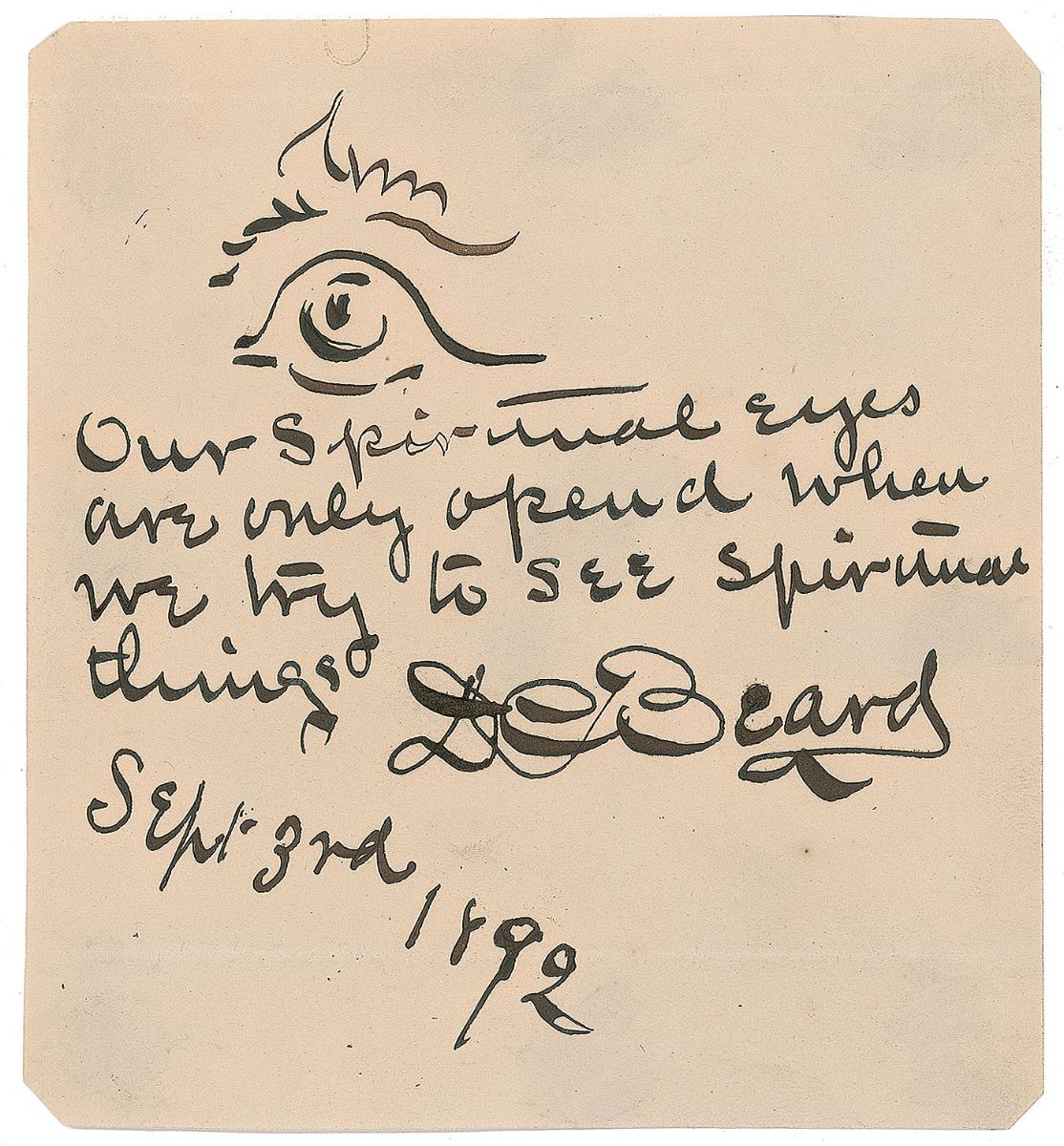Two items: an AQS on an off-white 4.25 x 4.75 clipped sheet, reading, in full: “Our spiritual eyes are only open’d when we try to see spiritual things. DC Beard, Sept. 3rd, 1892,” adding a sketch of an eye above; and an ALS signed “Ernest Seton–Thompson,” one page, 4.5 x 7, February 2, 1900. Letter to Mr. Williams, in full: “Could you get the works marked in enclosed catalog sent on approval. I would certainly take several of them—pp 9 to 12, also one on p18. I will come down as soon as I hear, of course I will have expenses,” adding a small paw print. In overall very good to fine condition, with toning and paper loss to the Seton letter, which is mounted to a heavier card.