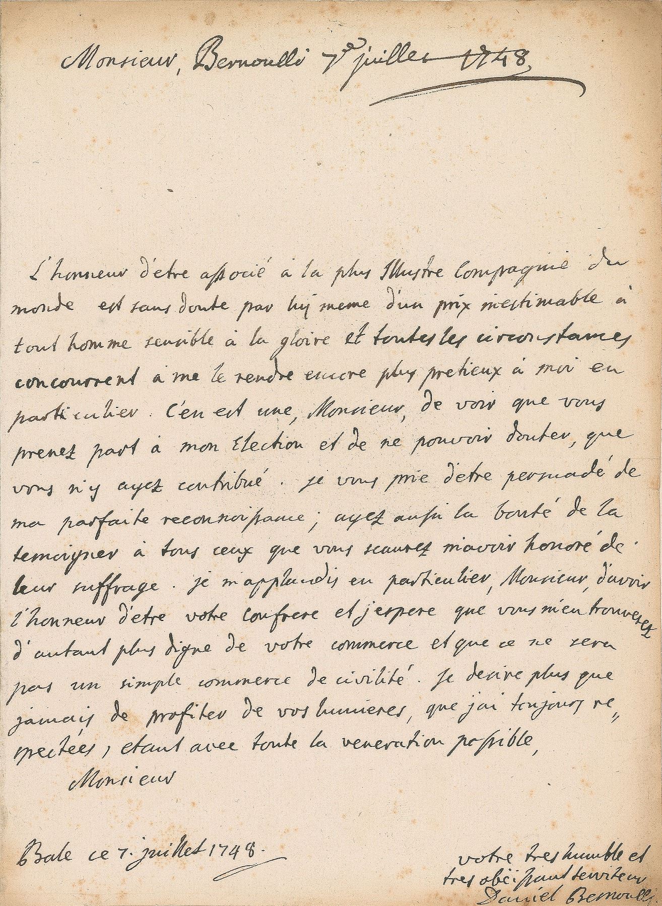 Swiss mathematician and physicist (1700–1782) known for his applications of mathematics to fluid mechanics. ALS in French, one page, 7.25 x 9.75, July 7, 1748. In full (translated): "The honor to be associated to the most renowned company in the world is by itself without a doubt an inestimable price to any man sentient of glory, and all the circumstances converge to make it even more precious to me in particular. It is one [glory], Sir, to see that you are taking a part in my election and have no doubt that you have contributed to it in my favor. Please be assured of my true gratitude; also have the kindness to testify to that fact to all that you know having honored me by their suffrage. I am particularly congratulating myself, Sir, to have the honor to be your colleague and I hope that you will find me even more worthy of your commerce and that it would not only be only a commerce of civility. I desire more than ever to take advantage of your insight that I have always respected." In fine condition, with light foxing and edge toning.