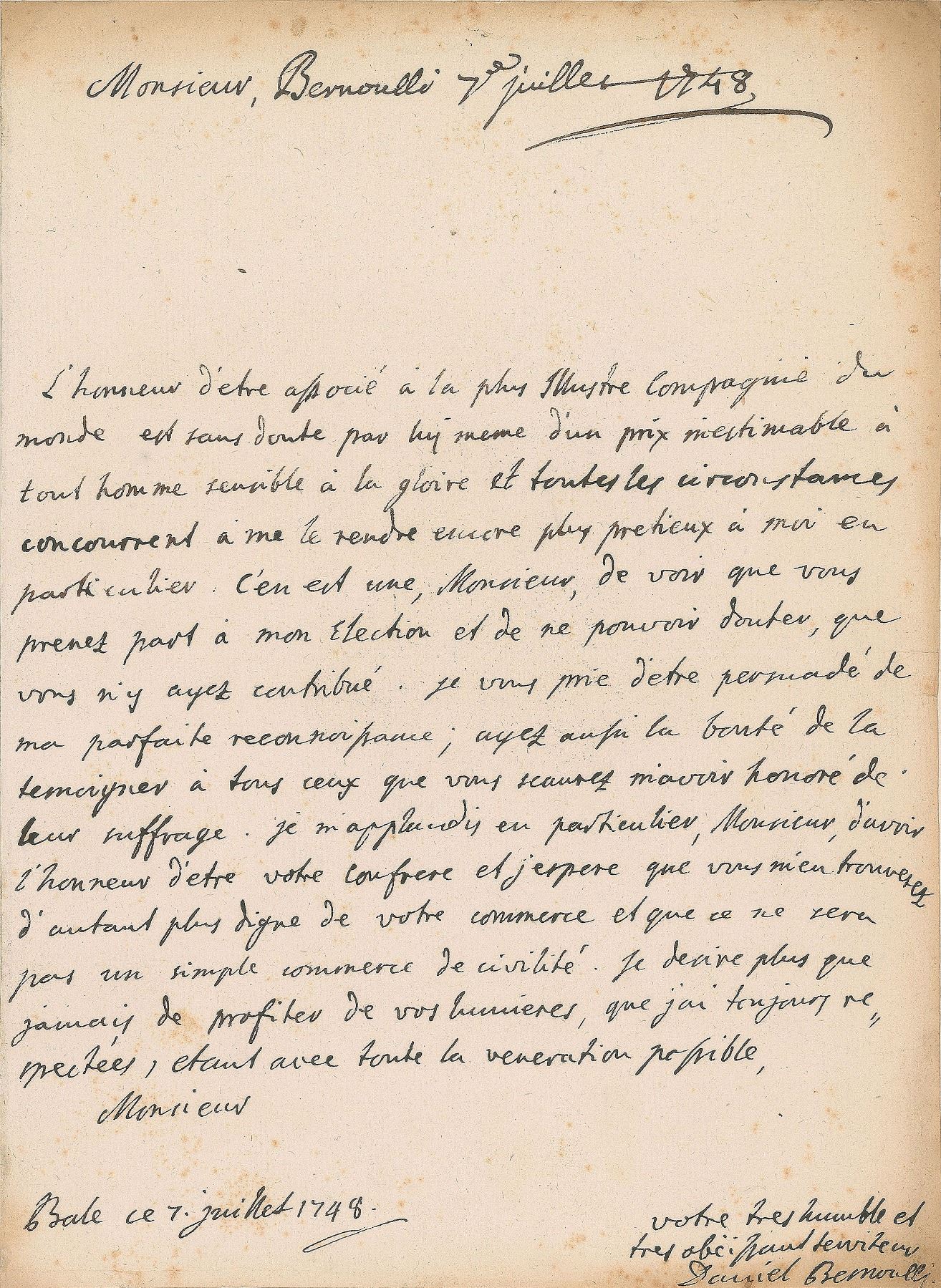 Swiss mathematician and physicist (1700–1782) known for his applications of mathematics to fluid mechanics. ALS in French, one page, 7.25 x 9.75, July 7, 1748. In full (translated): "The honor to be associated to the most renowned company in the world is by itself without a doubt an inestimable price to any man sentient of glory, and all the circumstances converge to make it even more precious to me in particular. It is one [glory], Sir, to see that you are taking a part in my election and have no doubt that you have contributed to it in my favor. Please be assured of my true gratitude; also have the kindness to testify to that fact to all that you know having honored me by their suffrage. I am particularly congratulating myself, Sir, to have the honor to be your colleague and I hope that you will find me even more worthy of your commerce and that it would not only be only a commerce of civility. I desire more than ever to take advantage of your insight that I have always respected." In fine condition, with light foxing and edge toning.